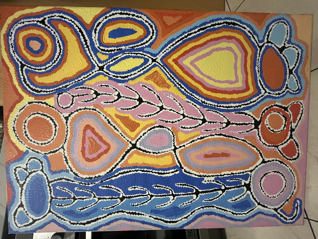 "Tableau 2010 aborigènes Artistes : judy Watson napangardi Mina mina Taille : long 87 cm Large :69 cm"