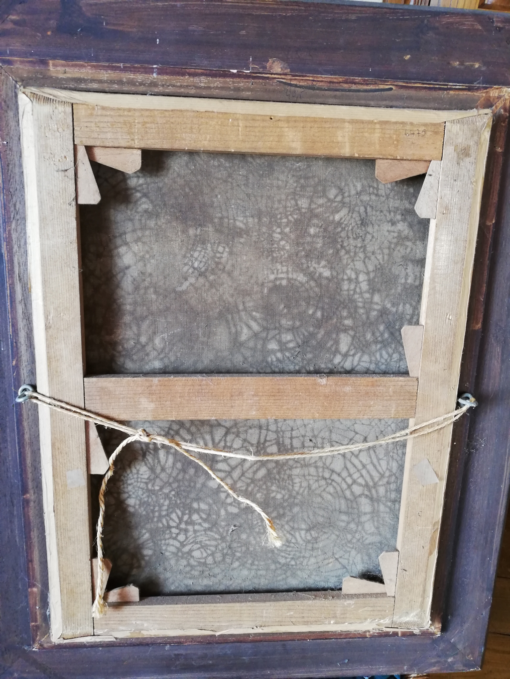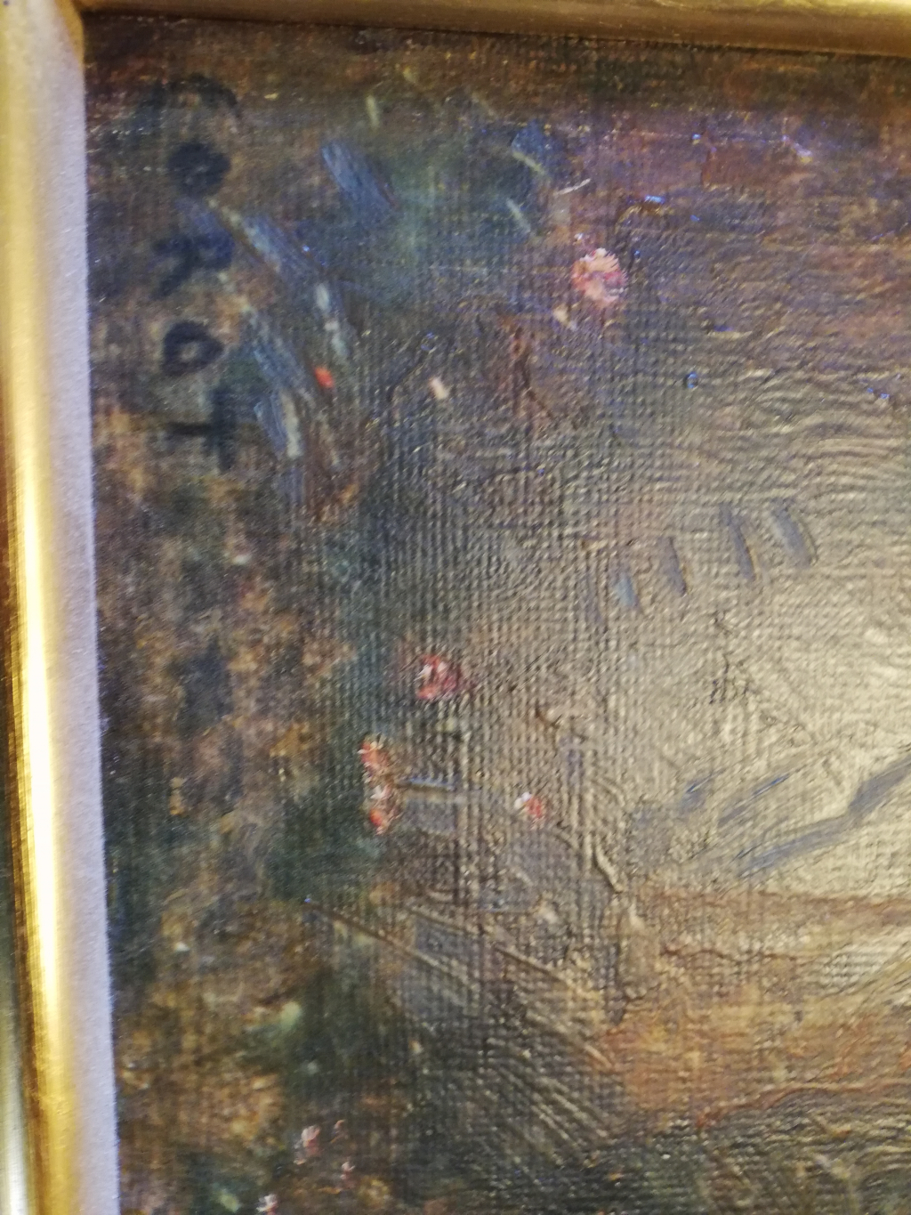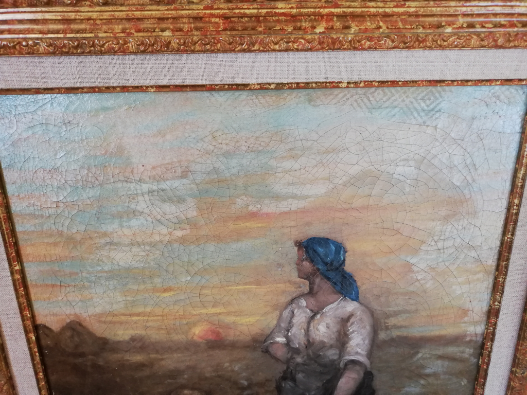 "Huile sur toile signée Jules Breton, craquelée en spirale, acquise dans les années 80, représentant 2 glaneuses, l'une debout, de profil, l'autre accroupie, de dos, sur fond assez sombre de coucher de soleil. Tracé pas très précis. Vendu comme étant original avec certificat d'authenticité (actuellement égaré) mais doutes sur la fiabilité du certificat."