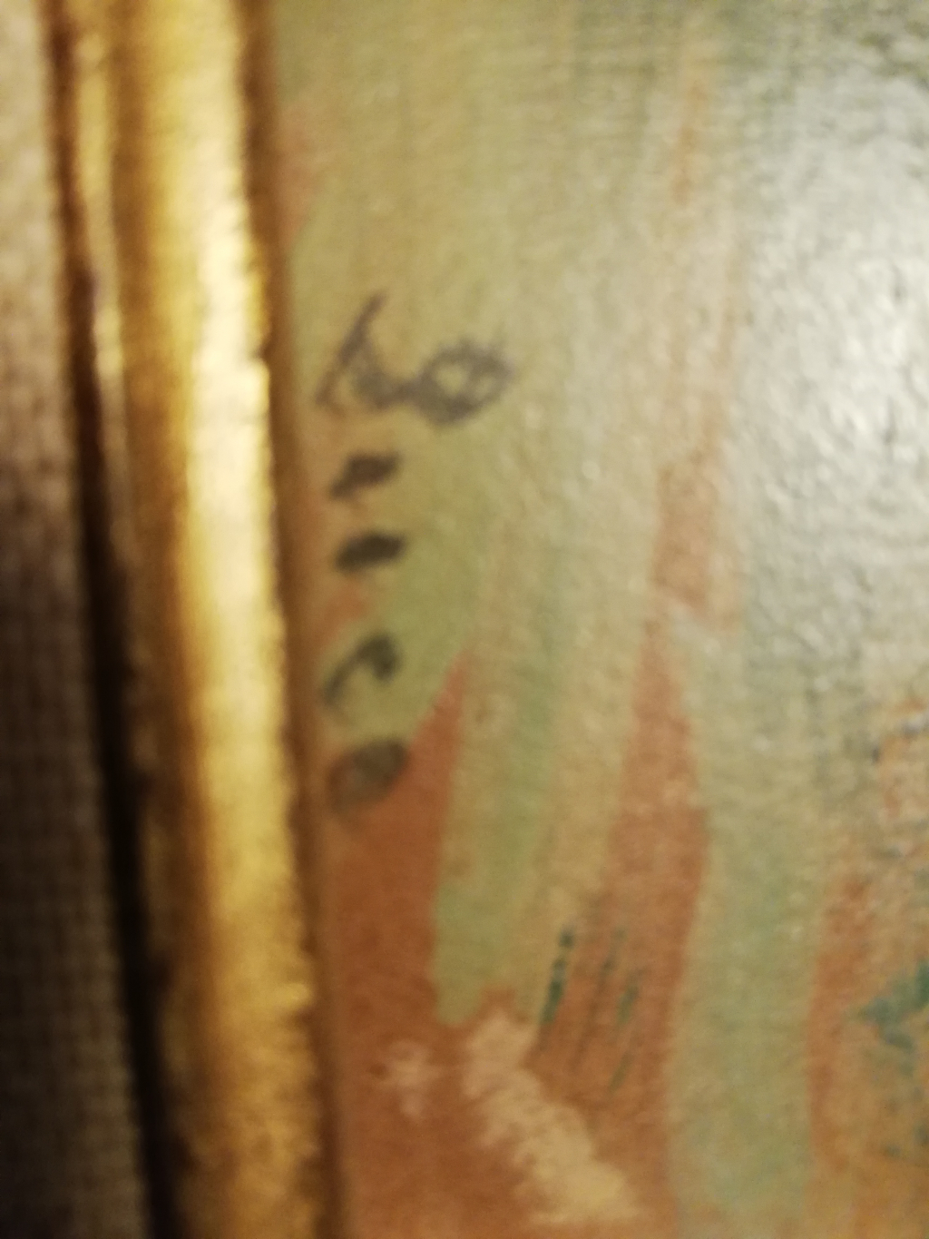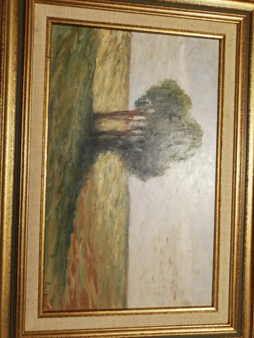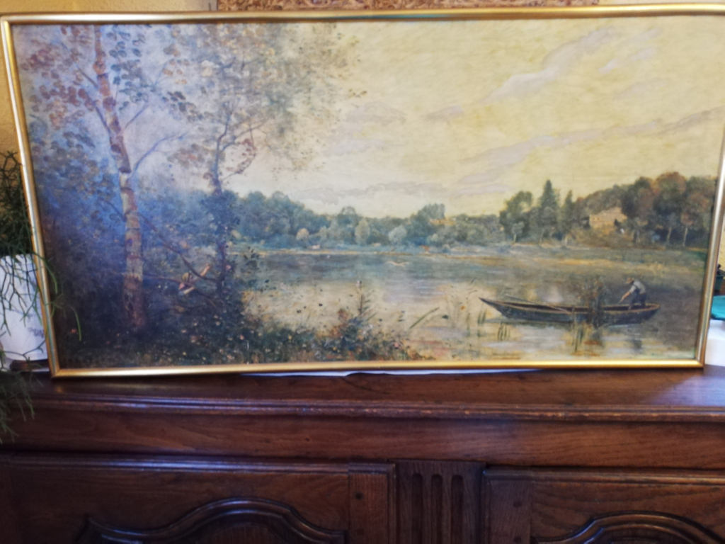 "Huile sur toile signée Jules Breton, craquelée en spirale, acquise dans les années 80, représentant 2 glaneuses, l'une debout, de profil, l'autre accroupie, de dos, sur fond assez sombre de coucher de soleil. Tracé pas très précis. Vendu comme étant original avec certificat d'authenticité (actuellement égaré) mais doutes sur la fiabilité du certificat."