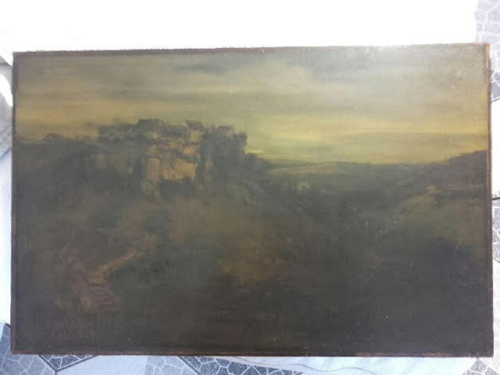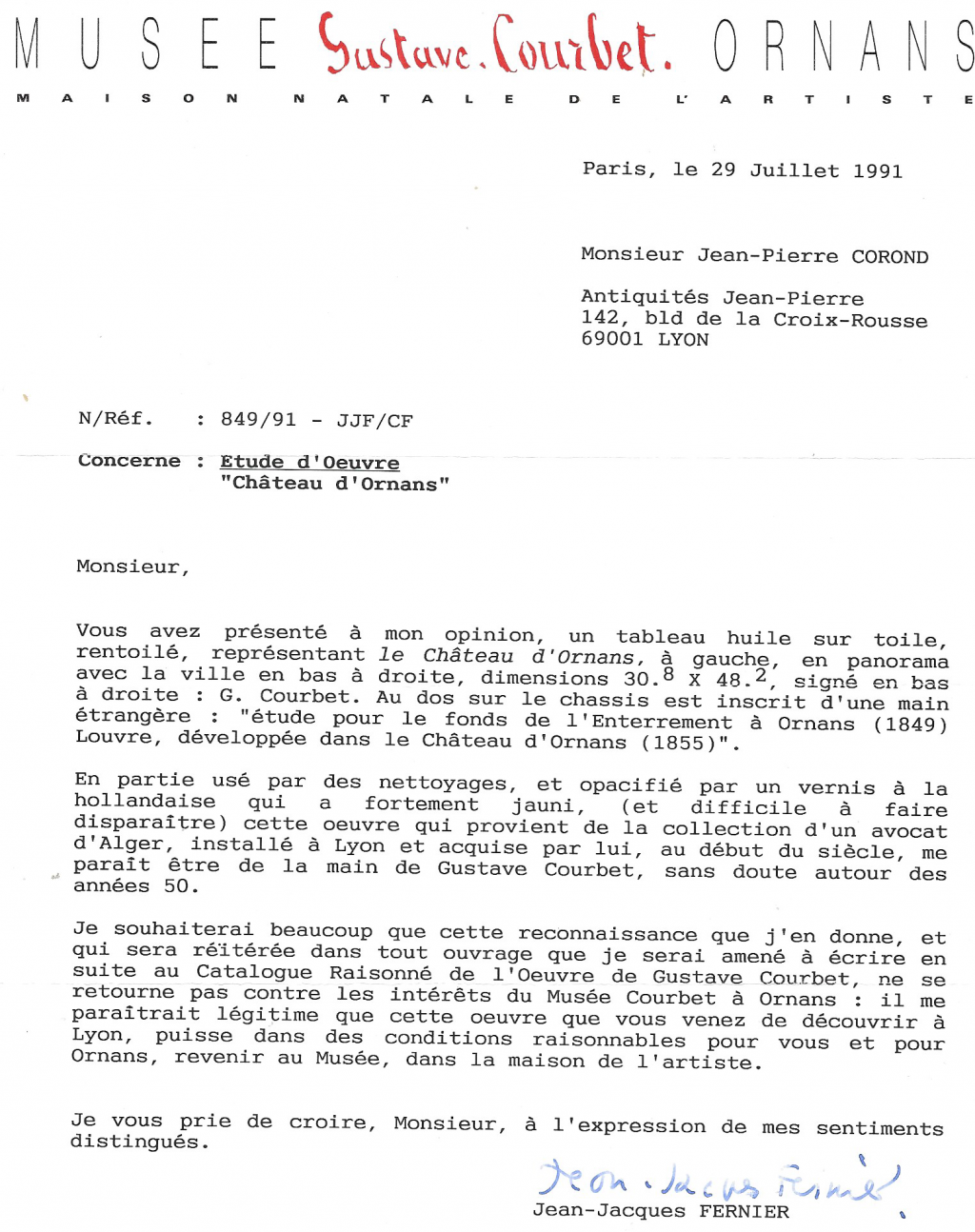 La première approche d’un professionnel du marché de l’art est visuelle. Nos équipes étudient dans un premier temps les différentes photographies de vues d’ensemble et de détails envoyées par le déposant avec sa demande : Le Château D'Ornans signé G. Courbet en rouge à dr en bas.