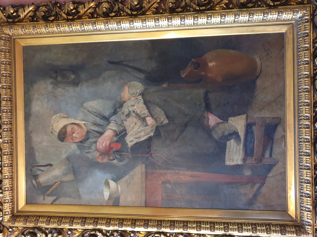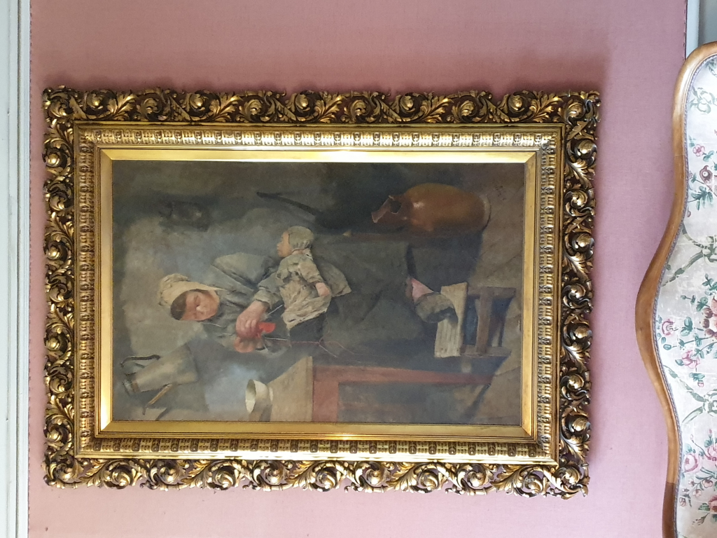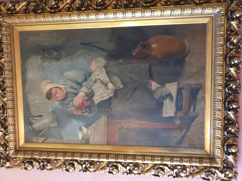 "Léon Frédéric 1884 Huile sur toile signée en bas à droite 142 x 91 cm "Dame assise tricotant dans une cuisine, un enfant sur les genoux " Cadre doré aux grandes acanthes ajourées."
