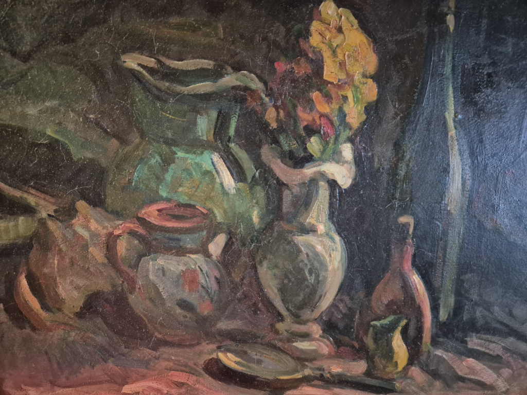 "Tableau recto verso avec bro, bouteille et fleurs."