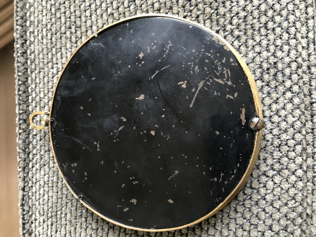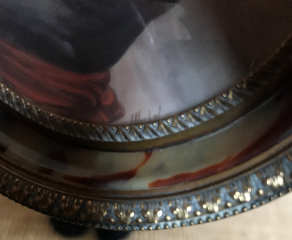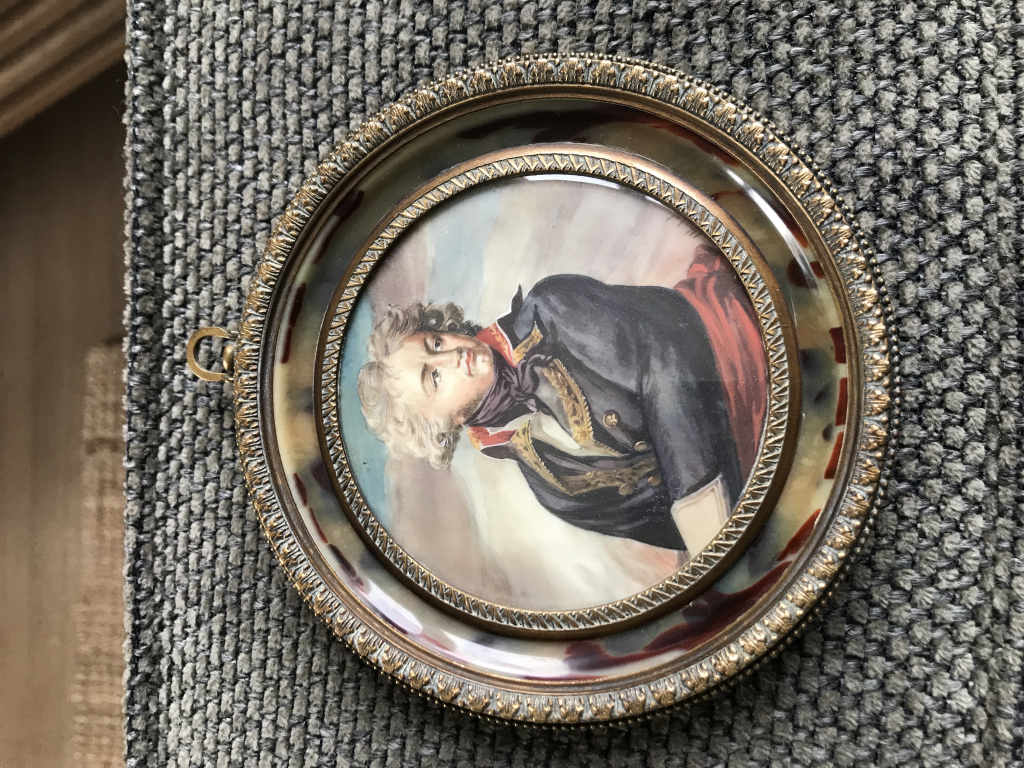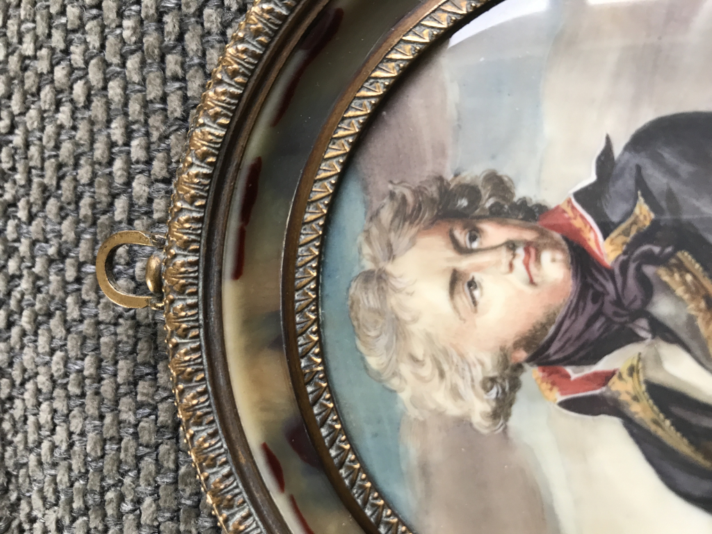 "Miniature ancienne circulaire représentant peut-être le general Kleber. Encadrement sûrement en laiton et matière type ecaille. Diamètre 11,5cm."
