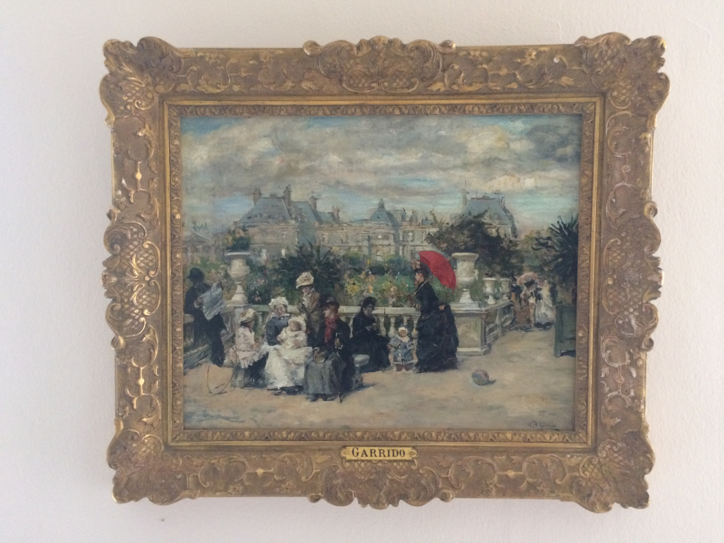 "Scène d'une sortie en famille dans le parc d'un château. Peinture sur bois. Tableau et cadre en très bon état."