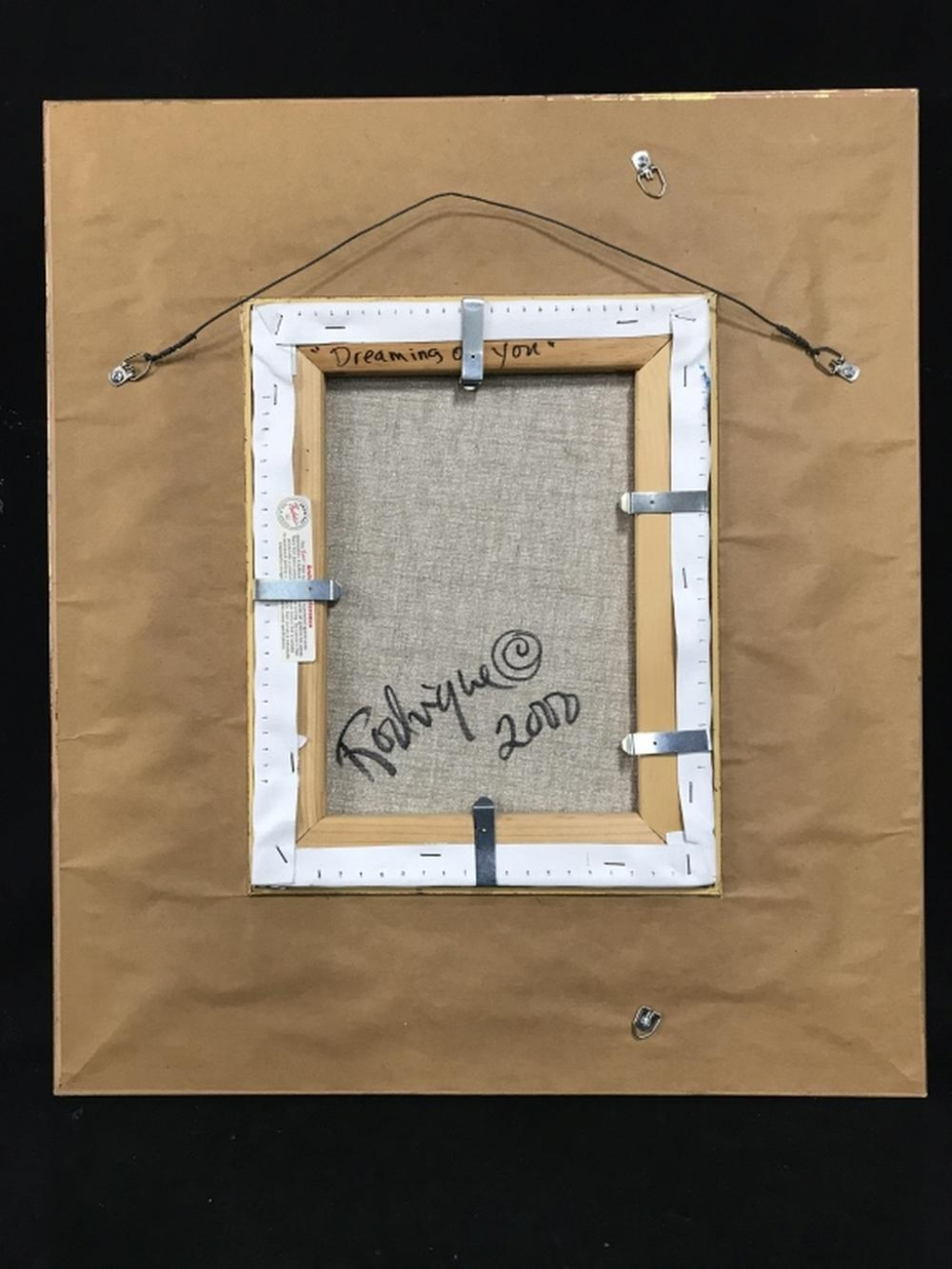 "Peinture sur toile signée représentant le célèbre chien aux yeux bleus et aux yeux jaunes de Rodrigue parmi des fleurs roses dans un environnement bleu. Signé RODRIGUE dans le coin inférieur gauche. Verso porte le titre manuscrit «Dreaming of You» et date de 2000."