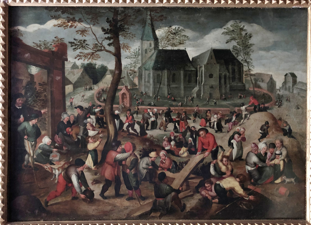 "Peinture sur support bois restauré. Peut-être une école de Brueghel (1550). Bon état général. Personnages peints dans le style de Brueghel l'ancien (couleurs, expressions, thème de fête paysanne dans un village). Tableau de famille à l'origine inconnue."