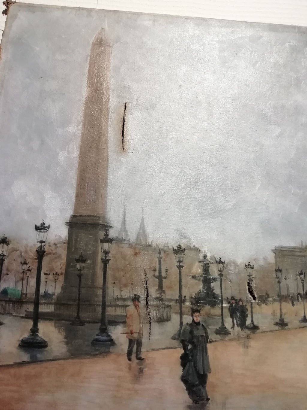La première approche d’un professionnel du marché de l’art est visuelle. Nos équipes étudient dans un premier temps les différentes photographies de vues d’ensemble et de détails envoyées par le déposant avec sa demande : Place de la concorde après une averse Abel Truchet 1892.