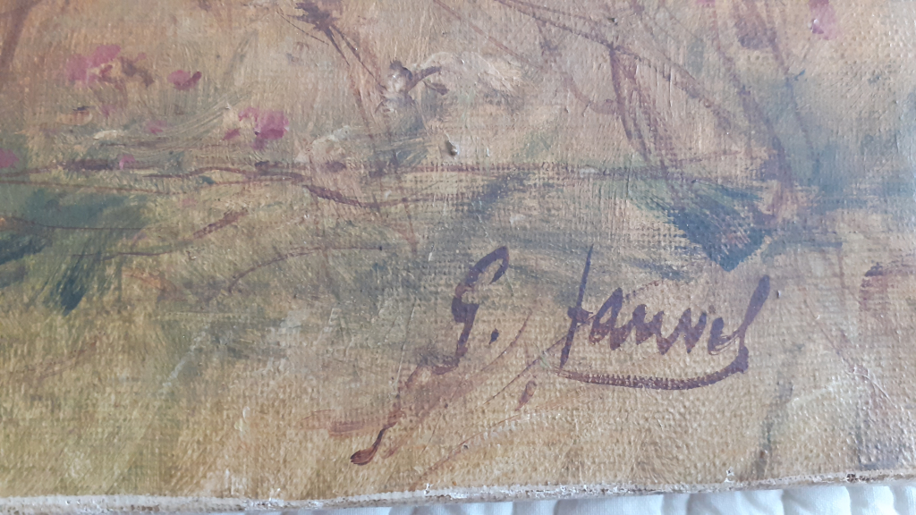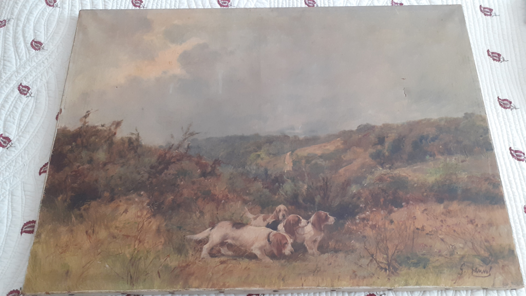 France estimations a reçu la demande d'estimation suivante intitulée par le déposant : Tableau ancien paysage et chiens signé G. Fauvel.