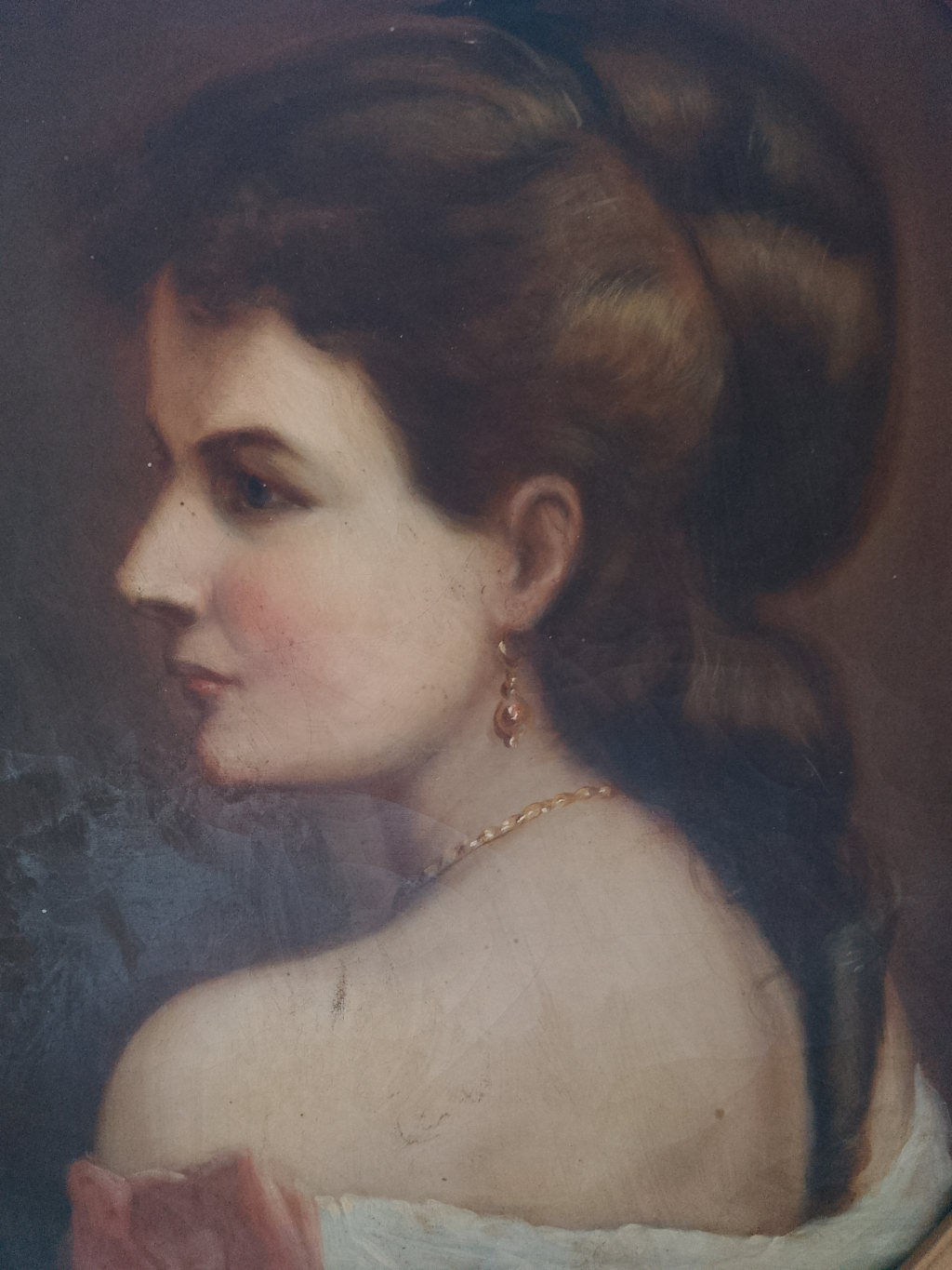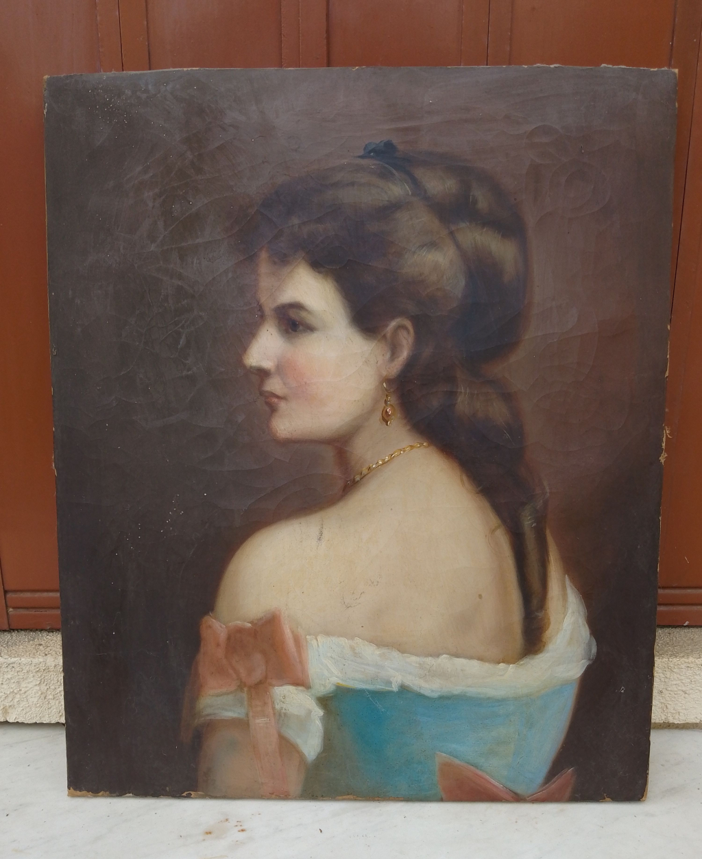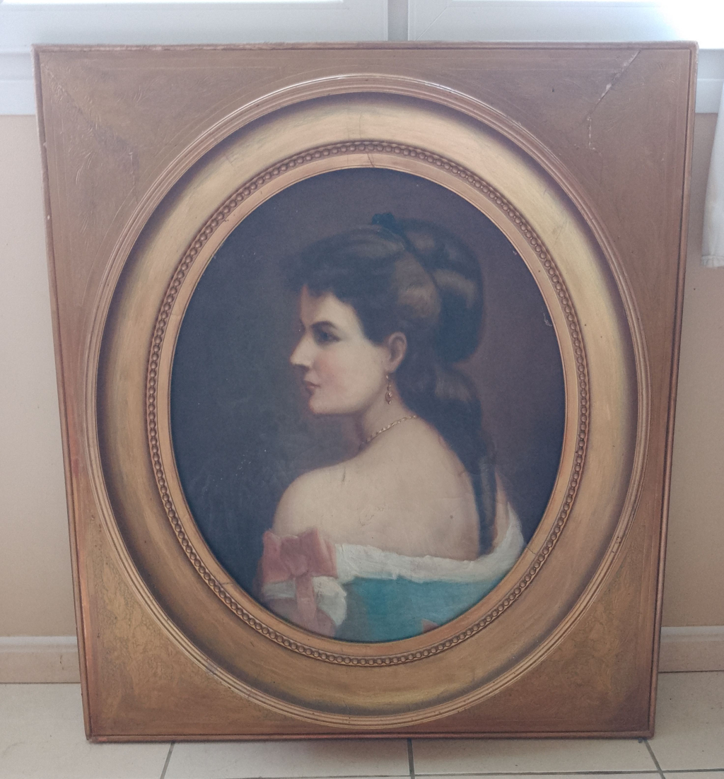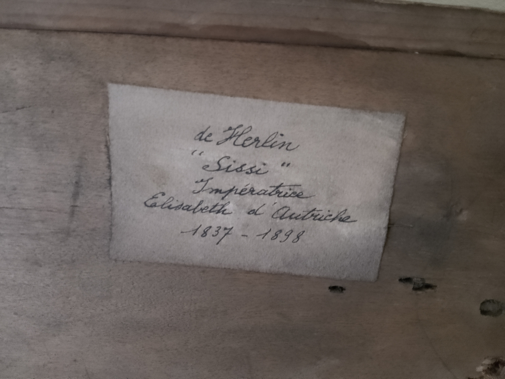 "Tableau avec inscription au dos "de Herlin, sisi l'impératrice, elisabeth d'autriche 1837-1898". Aucune restauration à prévoir sur la toile en elle-même excepté un nettoyage. Cadre à restaurer. Dimensions totales : haut 92 cm x large 81 cm. Toile : haut 65,5 cm x 55 cm"