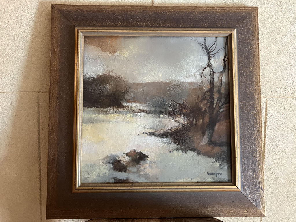 "Jean Claude Bourgeois (1932-2011) Doubs, France Bords de la Loue paysage d'hiver signé par artiste en bas à droite encadré bon état achat en 1999"