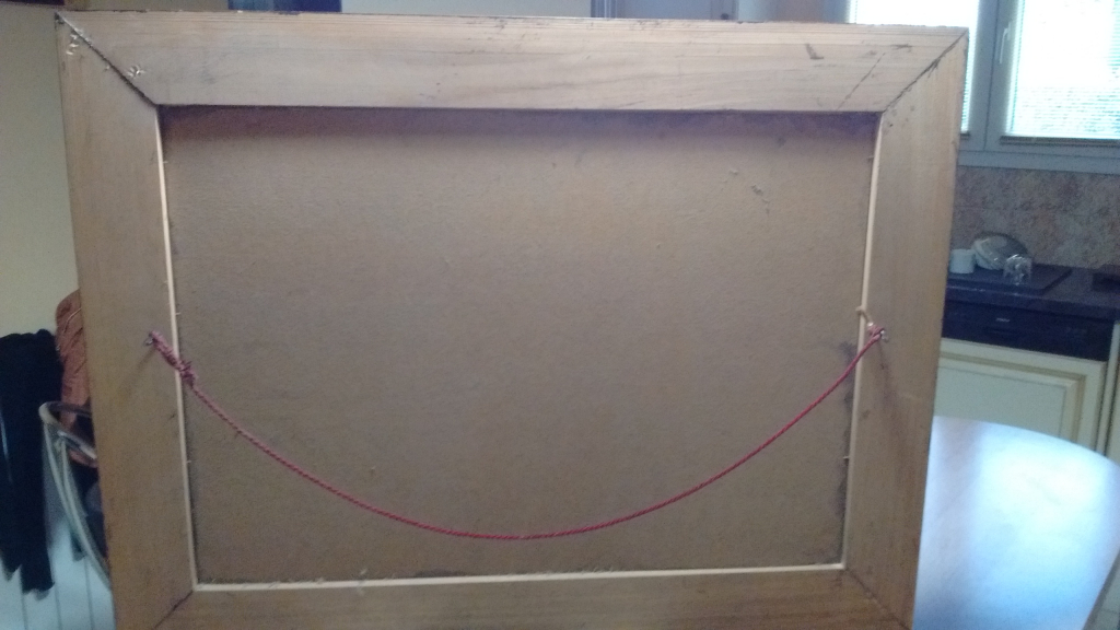 "Tableau en trés bon état trouver chez ma mère décédée, avec pris d'achat à 1000 francs; semble êrte une peinture à l'huile sur plaque de bois fin; dimention sans cadre ;70 x50 cm et avec cadre 90x70cm"