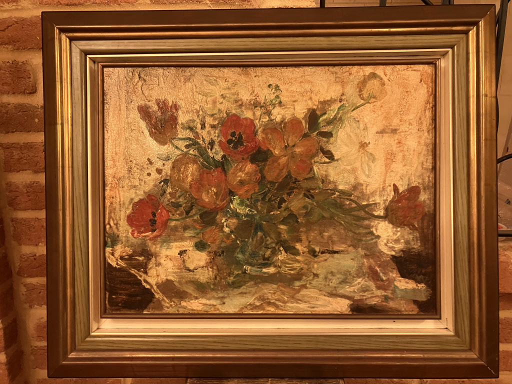 "Lê Phô (1907-2001) Bouquet de tulipes -N 523 Tulipes rouges et oranges et vase bleu - Nature morte florale peint sur isorel signé par artiste en bas à droite Tableau encadré mais l'encadrement a besoin d'un peu de reparation bon état"