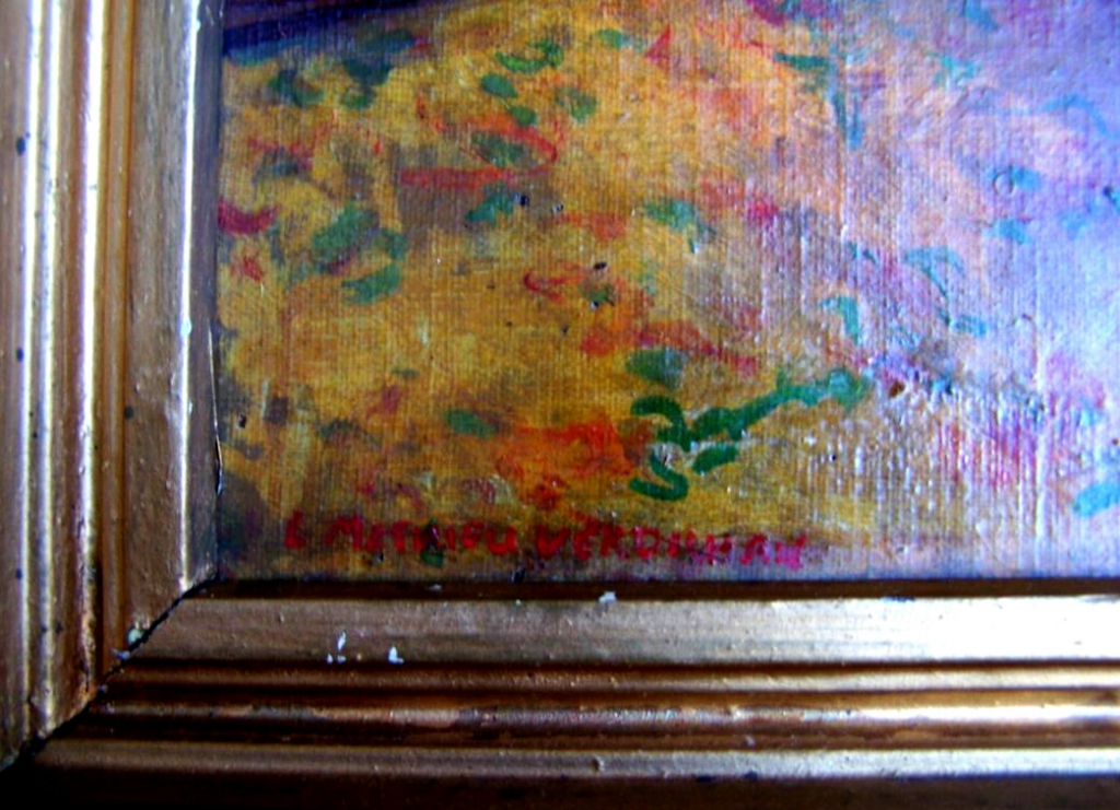 "Huile sur toile dans son jus début XX° probablement entre 1910-1920 intérieur d'Atelier sur le vieux port de Marseille ( on peut apercevoir les 3 mâts à travers la fenêtre) oeuvre expressionnisme du peintre Louis Mathieu Verdilhan. Elle est signée en rouge dans la peinture "L Mathieu Verdilhan " au dos un tampon sec de marque XIXème siècle avec ancre & caducée . Il occupa d'aillers un atelier de 1910-1914 au 12 quai rive neuve dans un ancien entrepôt où sont déjà installés les peintres Giraud et Lombard cet ensemble d'informations nous confirme que le tableau serait daté de la période 1910-1914 soit avant la première guerre mondiale."