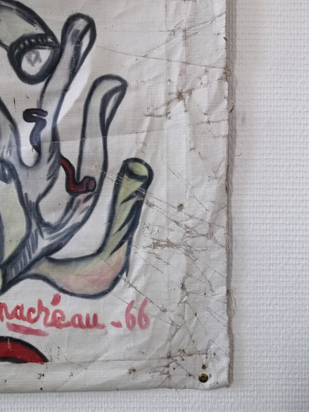 "signé Macréau 66, il daterait donc de 1966 ,toile sortie de son support en bois. Retrouvé dans le grenier d'une maison vétuste à proximité de la ville de Bourges. Zone ou Michel Macréau aurait surement séjourné à partir de 1964. Les murs de la maison été d'ailleurs recouvert de peintures murales du même style . Taille 110cm x 87cm. La toile présente des traces de détériorations du a son mauvais conditionnement . Retrouvé plié au sol."