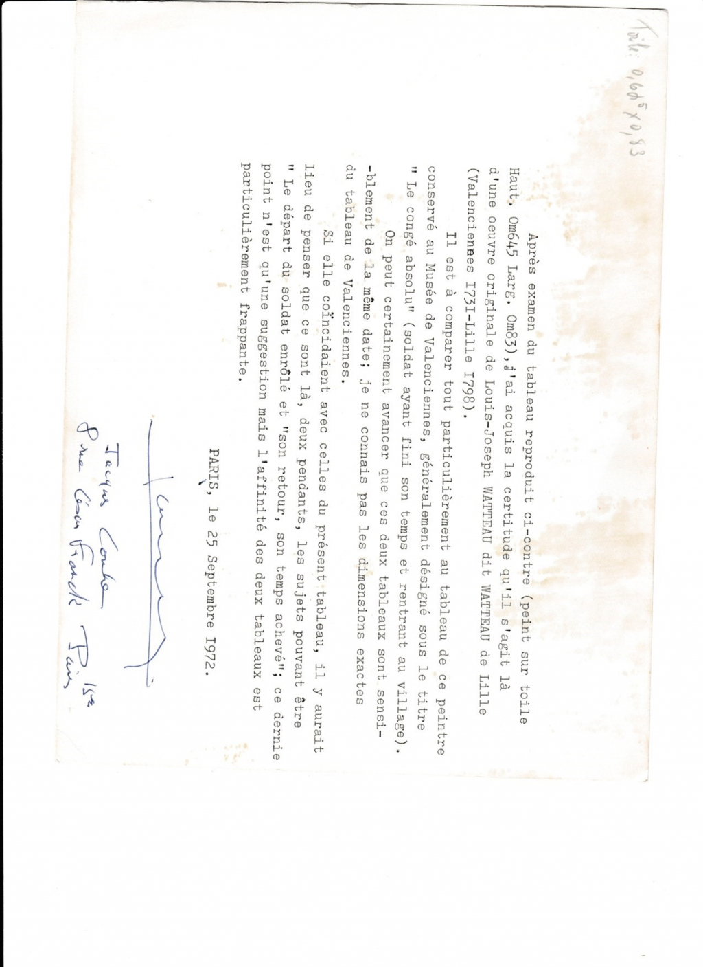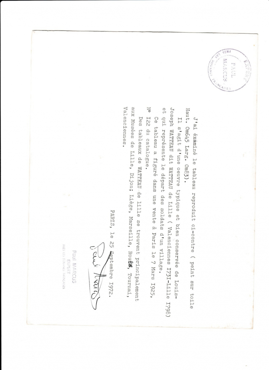 La première approche d’un professionnel du marché de l’art est visuelle. Nos équipes étudient dans un premier temps les différentes photographies de vues d’ensemble et de détails envoyées par le déposant avec sa demande : WATTEAU LOUIS JOSEPH départ des soldats d'un village.