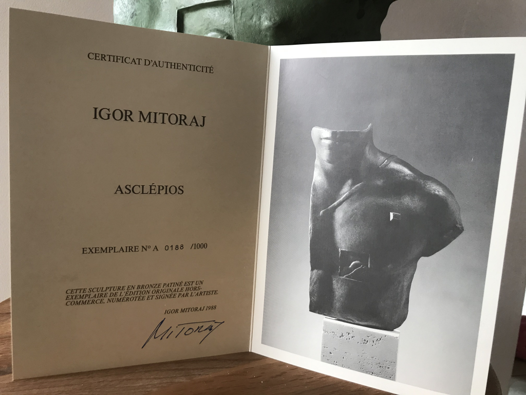 "Asclepios de Igor MITORAJ en bronze a patine verte, numéro 188/1000, sur socle, avec certificat d’authenticité Hauteur 48cm avec socle"