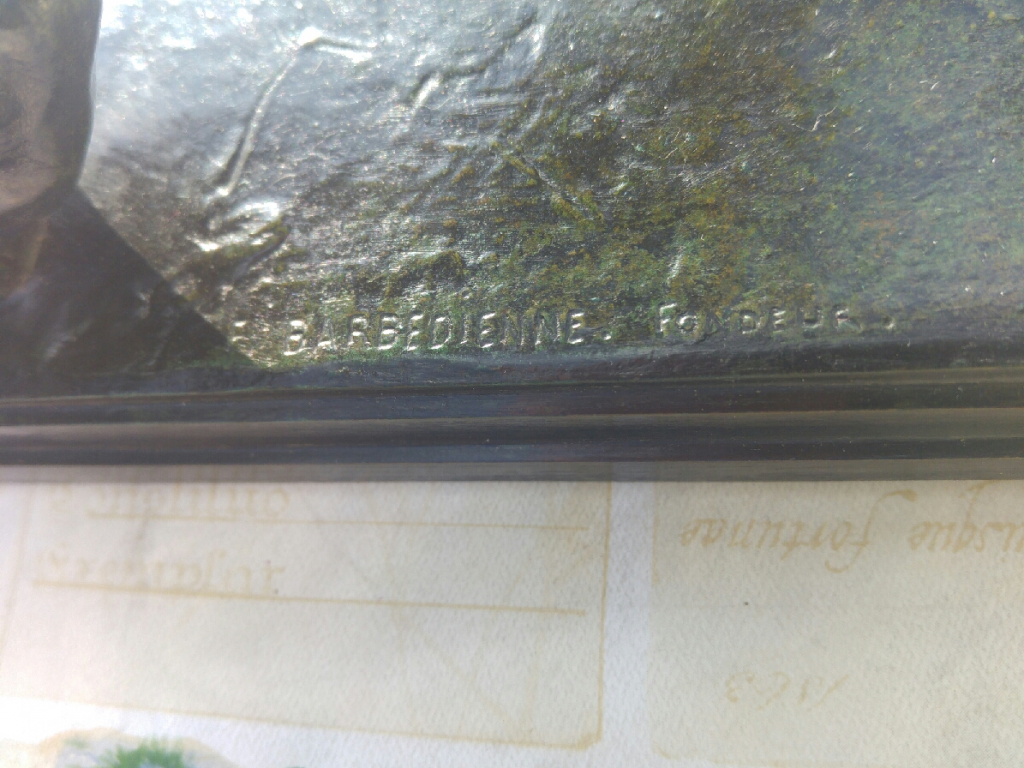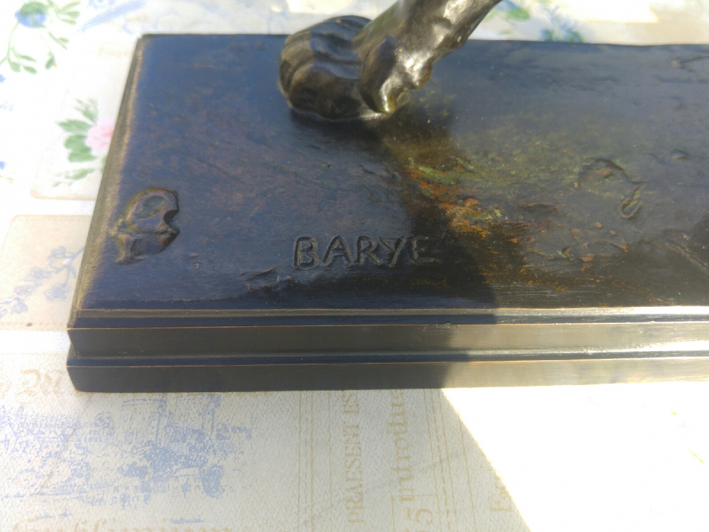 "Bonjour, j'aimerais connaître l'estimation d'une paire de bronzes d'Antoine Louis Barye, le lion marchant et son pendant, le tigre marchant, de fonte ancienne du 19ème, vers 1880 (cf photos du catalogue raisonné MM Richarme et Poletti, montrant la calligraphie "F. BARBEDIENNE.FONDEUR.", datant la fonte de 1876 à fin 19ème et le montage du dessous typique des bronzes Barbedienne vers 1880). Ce qui situerait la période de fonte pour cette paire de bronzes vers 1880, au tout début des éditions de Barye par Ferdinand Barbedienne suite à l'acquisition de nombreux chefs modèles, lors de la vente Barye en 1876, un an après sa disparition le 25 juin 1875. Les dimensions sont: Pour le lion : H: 23 cm L totale: 42 cm L base: 39,6 cm l base: 10,3 cm Poids: 5,9 kg Pour le tigre: H: 21,5 cm L totale: 42,6 cm L base: 39,5 cm l base: 10,2 cm Poids: 5,4 kg Merci d'avance. Cordialement."