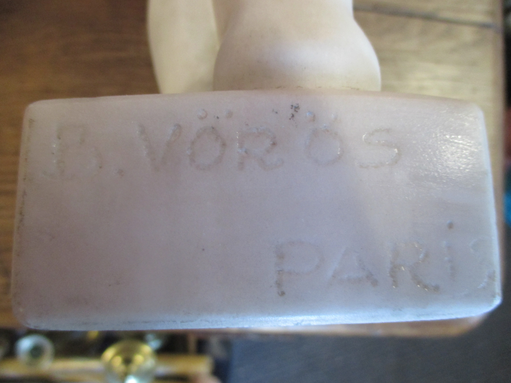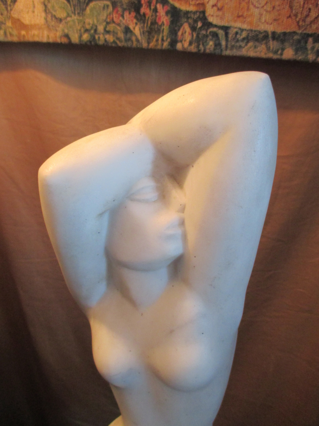 "Statuette très lourde, en marbre blanc, représentant une femme nue, les bras levés derrière la tête, et semblant marcher. environ 30 cm de hauteur. Sur socle carré monoxyle. Parfait état. Signature gravée à l'arrière du socle : Bella Vörös Paris."