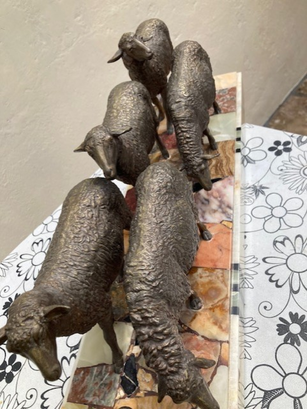 "Importante composition d'une bergère et ses 7 moutons (qui ont tous une position différente) en régule sur marbre en très bon état signé R. LULLIER; La tête et les bras sont en ivoirine, les bras portent des marques de rétractation au niveau de la jonction avec le régule. Le pavage est constitué de morceaux de marbre de différentes couleurs. Aucun manque ni coup. Longueur : 78 cms - largeur : 15.5 cms - hauteur : 51 cms - poids 20,75 kgs Je n'ai pas de facture, cet ensemble étant remisé au grenier depuis longtemps. Cordialement, Mme Deron"