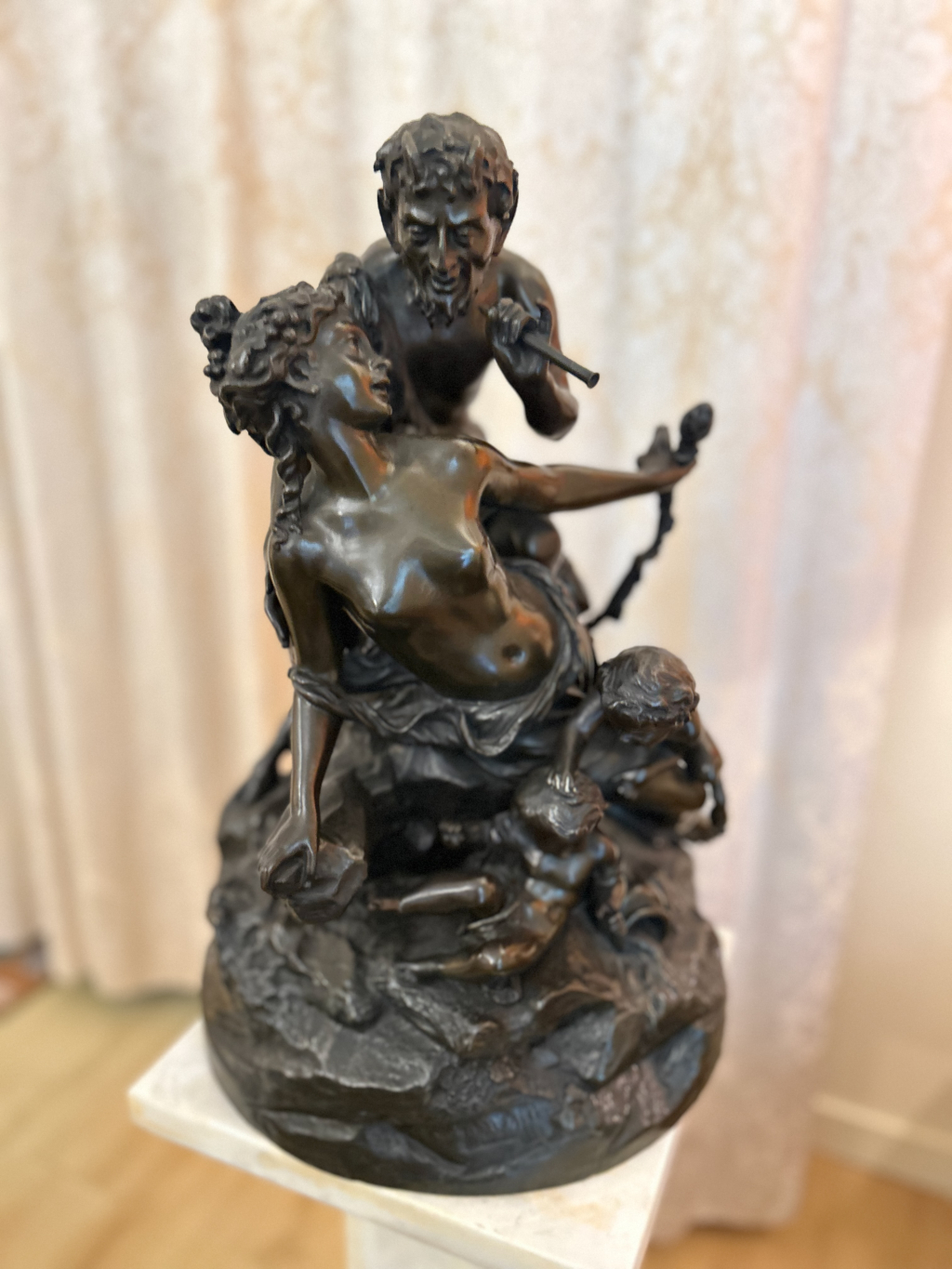 "bronze Clodion hérité de mes parents ,sujet mythologique =<br /> faune ,femme et enfant . H 50cm,diamètre 30 cm"