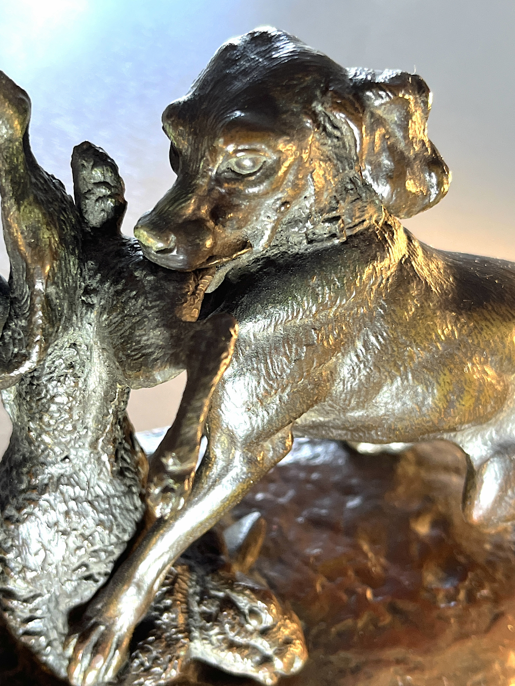La première approche d’un professionnel du marché de l’art est visuelle. Nos équipes étudient dans un premier temps les différentes photographies de vues d’ensemble et de détails envoyées par le déposant avec sa demande : Bronze de Jules Moigniez : chiens et lièvre en combat.