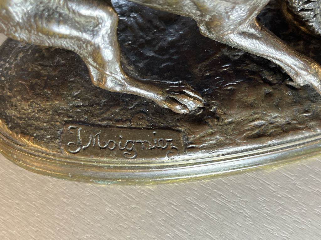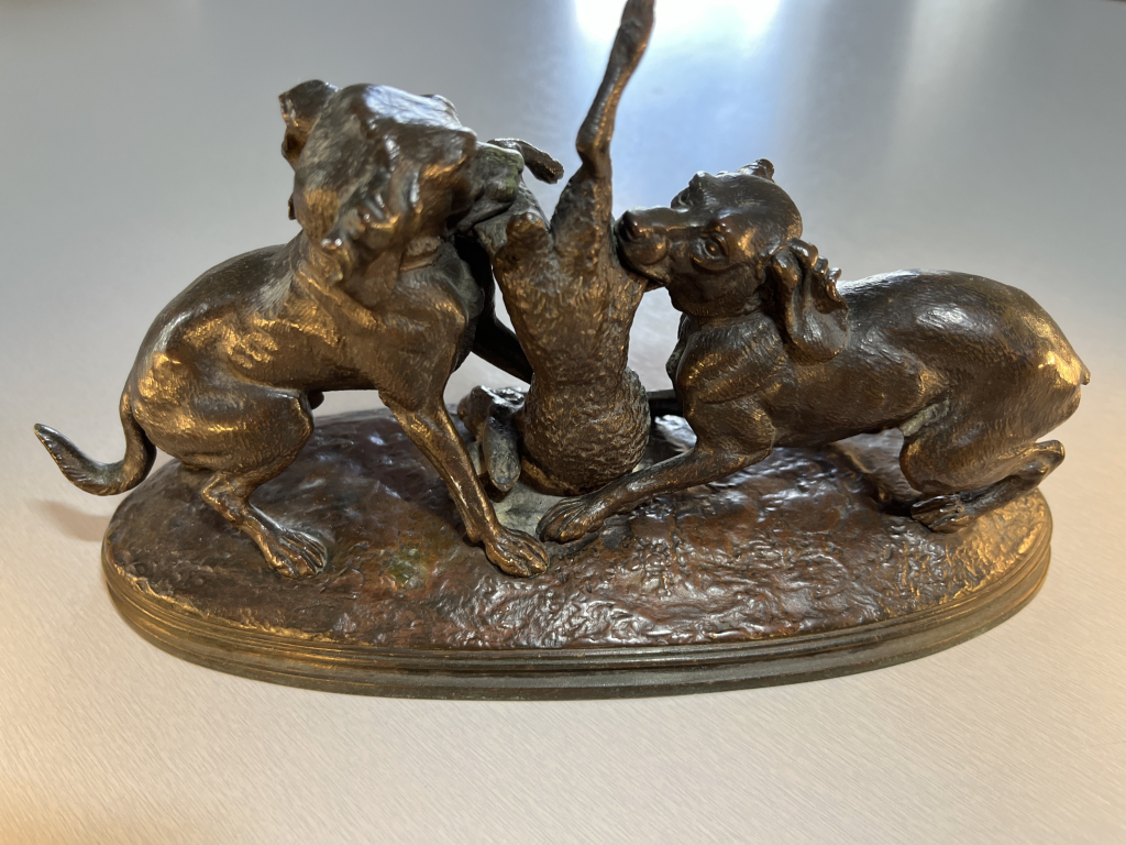 "Bronze de l'artiste Jules Moigniez représentant 2 chiens se disputant un lièvre, merci pour votre estimation ."