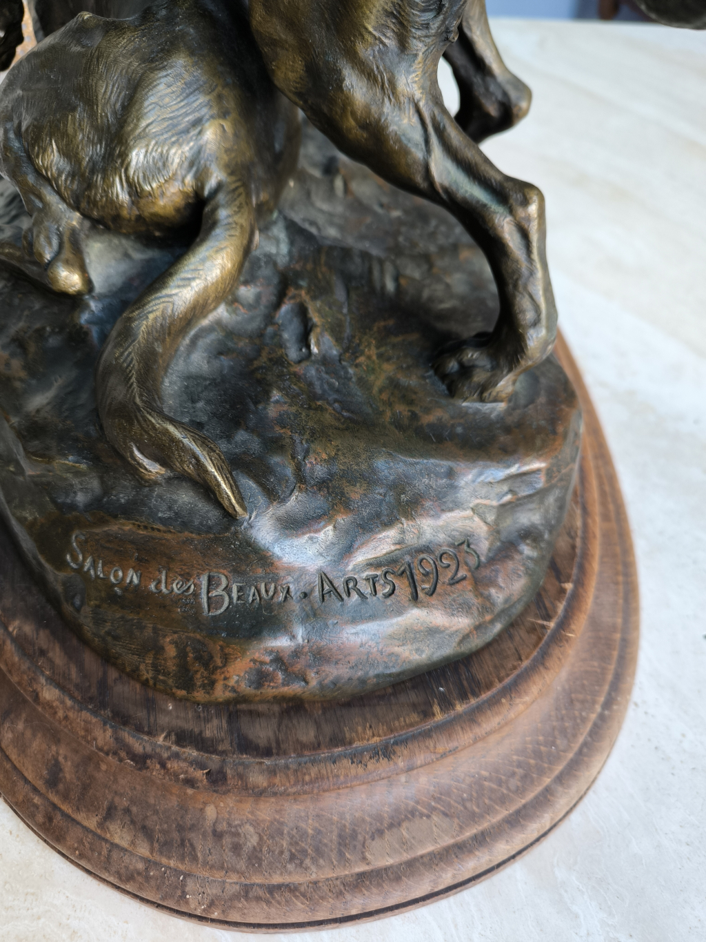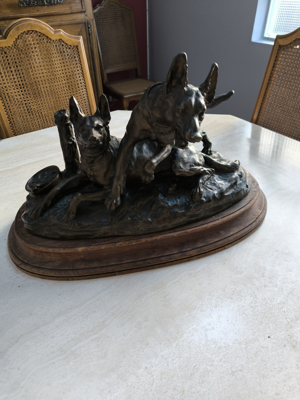 La première approche d’un professionnel du marché de l’art est visuelle. Nos équipes étudient dans un premier temps les différentes photographies de vues d’ensemble et de détails envoyées par le déposant avec sa demande : Bronze Deux Chiens Pierre Henri Varnier 1923.