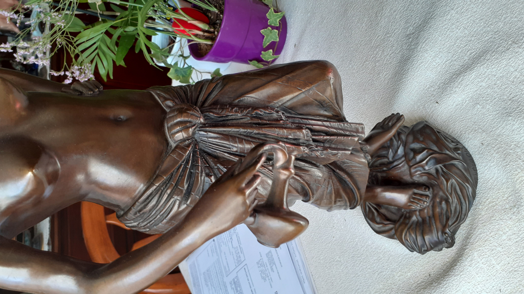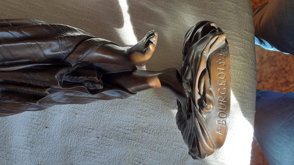 La première approche d’un professionnel du marché de l’art est visuelle. Nos équipes étudient dans un premier temps les différentes photographies de vues d’ensemble et de détails envoyées par le déposant avec sa demande : Bronze femme torse nu qui tient une carafe de A. Bourgeois.