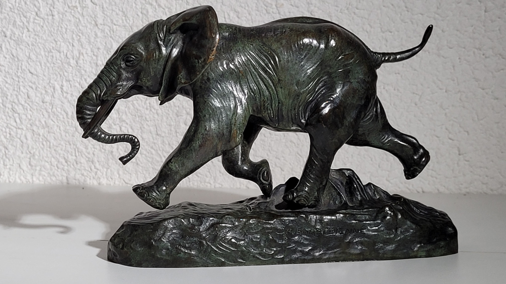 La première approche d’un professionnel du marché de l’art est visuelle. Nos équipes étudient dans un premier temps les différentes photographies de vues d’ensemble et de détails envoyées par le déposant avec sa demande : Bronze signé Barye Eléphant courant.