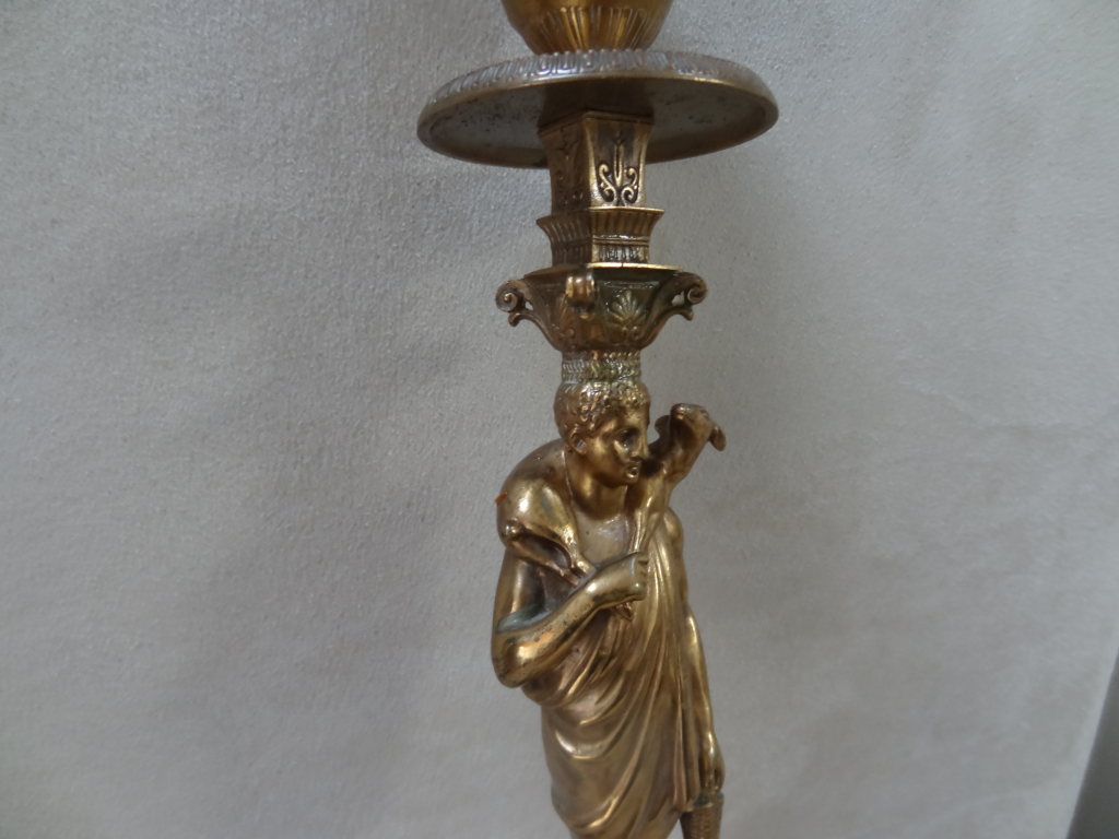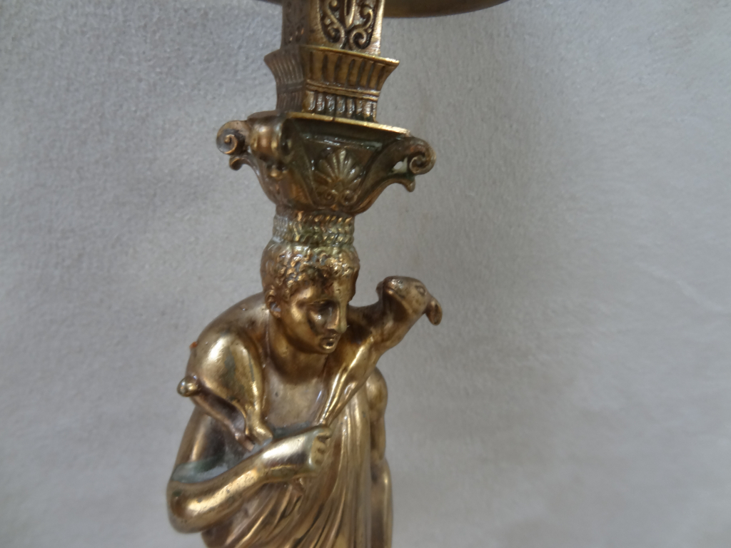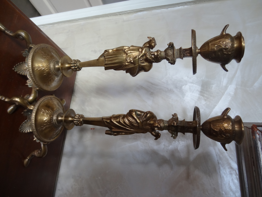 "2 chandeliers en bronze représentants pour l un ,un jeune berger portant sur ses épaules un agneau et dans une main un panier et l'autre ,un berger plus âgé qui porte un mouton et un couteau dans l'autre main , les deux sont surmontés d'un vase au motif grec"