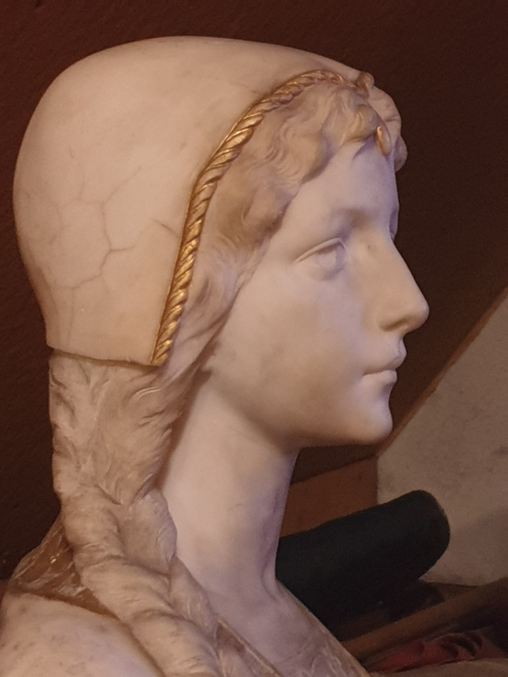 "il s'agit d'un buste de femme en marbre de carrare avec diadème et rubans doré comportant une base avec le lion ailé de Saint-Marc, symbole de la ville de Venise. Cette sculpture était chez mon grand père au moment de sa mort en 1958. elle a dû passer de famille en famille. il semble qu'elle ne soit pas signée (je n'ai pas regardé dessous)"