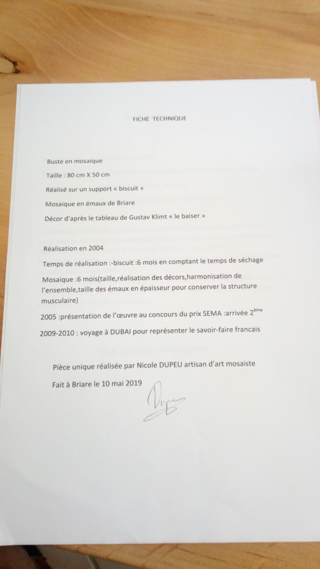 "Buste en biscuit de 2004, parfait état, oeuvre unique réalisé par Mme DUPEU Nicole. Taille 80 cm x 50 cm. Mosaïque en émaux de Briare (France)."