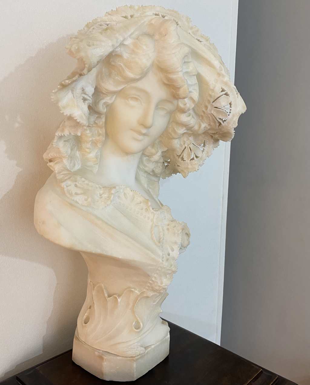 "Joli buste de jeune femme avec capeline, en marbre blanc signé de Adolfo Cipriani."