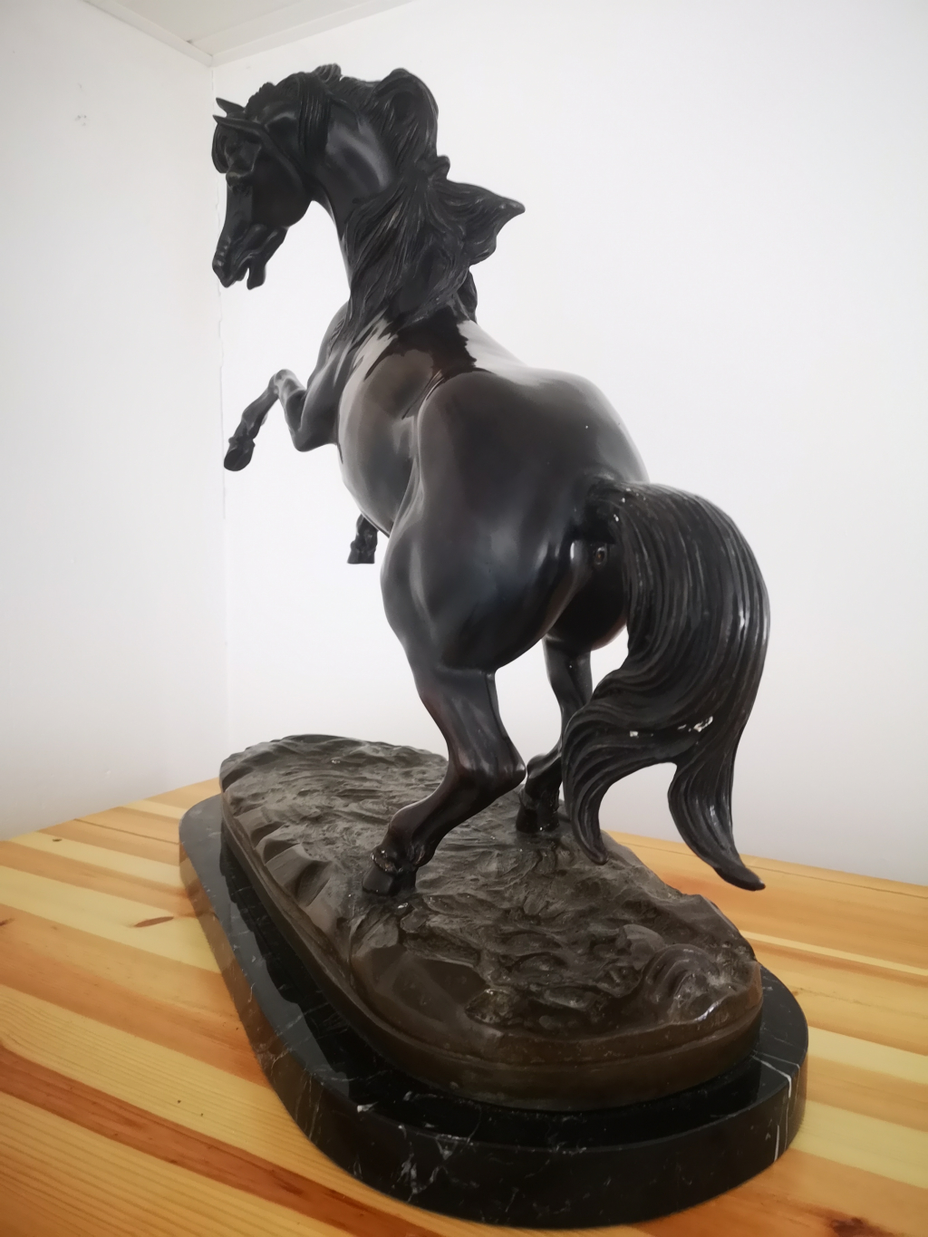 "Bronze d'un cheval cabré sur son socle en marbre noir de forme elliptique Sculpture bien détaillée et signée par l'artiste T. CAMPAIOLA En bon état, qui n'a jamais été rénovée. Présenté quelques traces blanches dans des interstices"