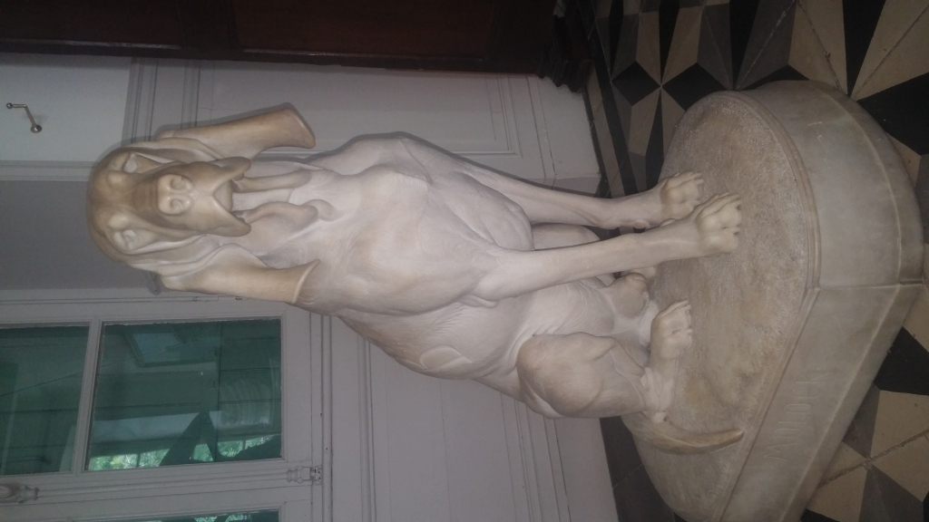 "Sculpture de Alfred Jacquemart représentant un chien de meute de chasse a cours. Dimensions 95 *70 * 40. Poids : 250-300 kg."