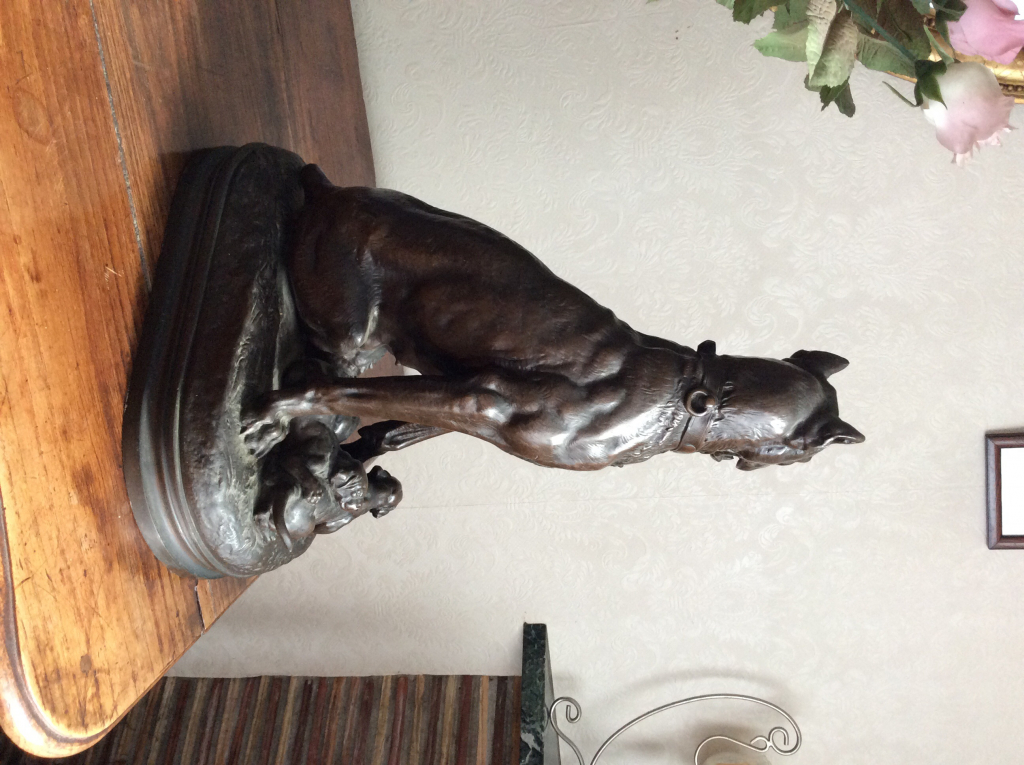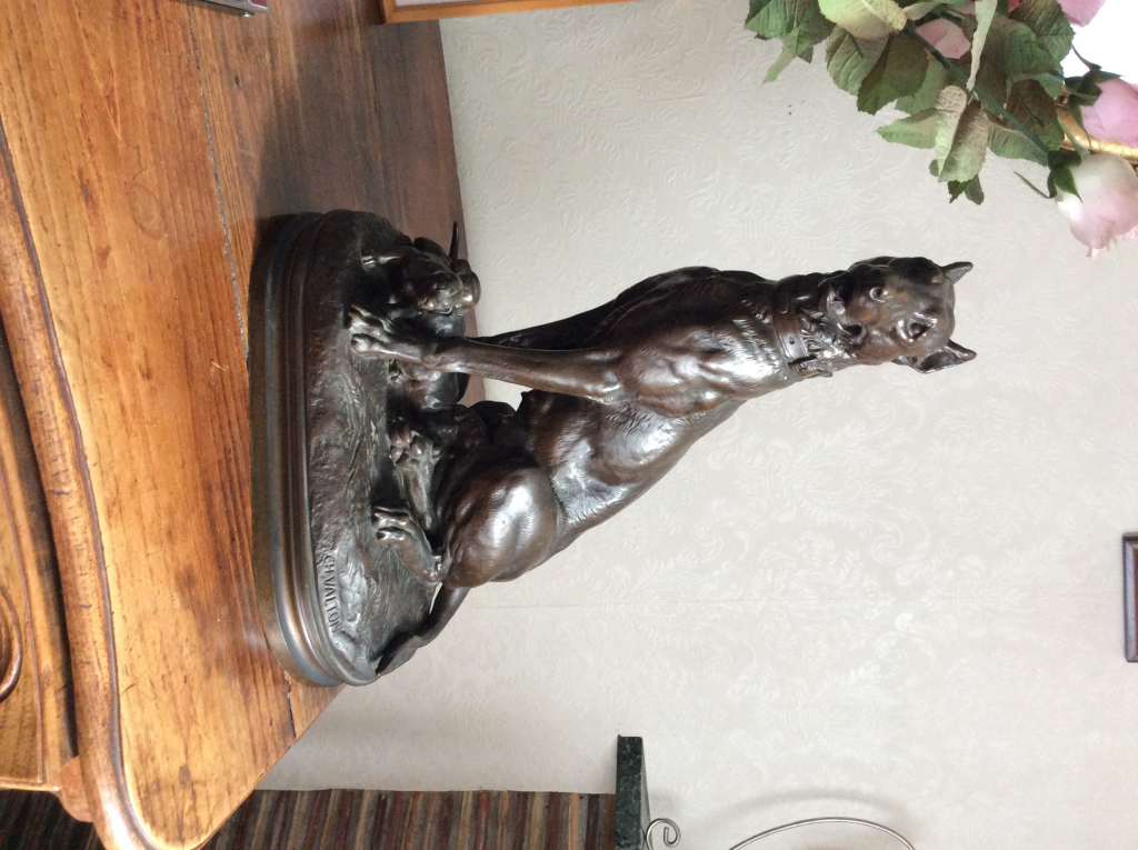 "Dans la famille depuis le début 1900, bronze animalier brun. Poids 12,7 kg Hauteur 45,5 cm Largeur base 34 cm"