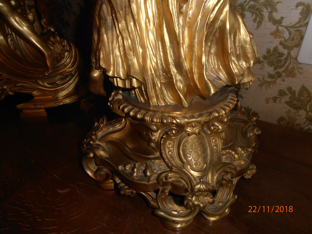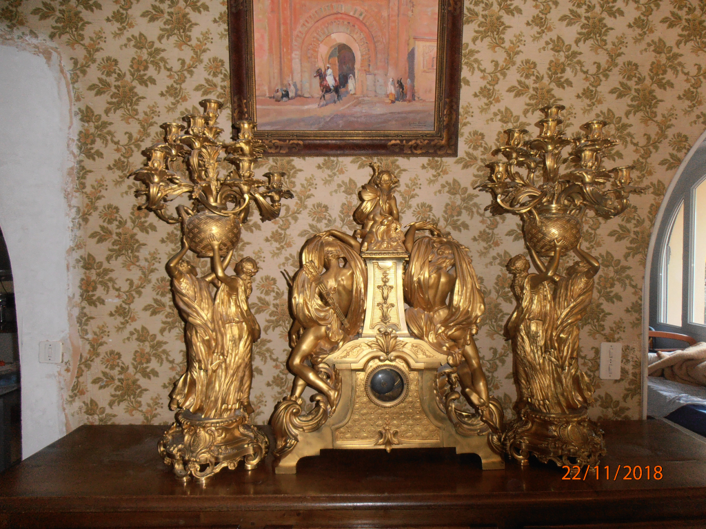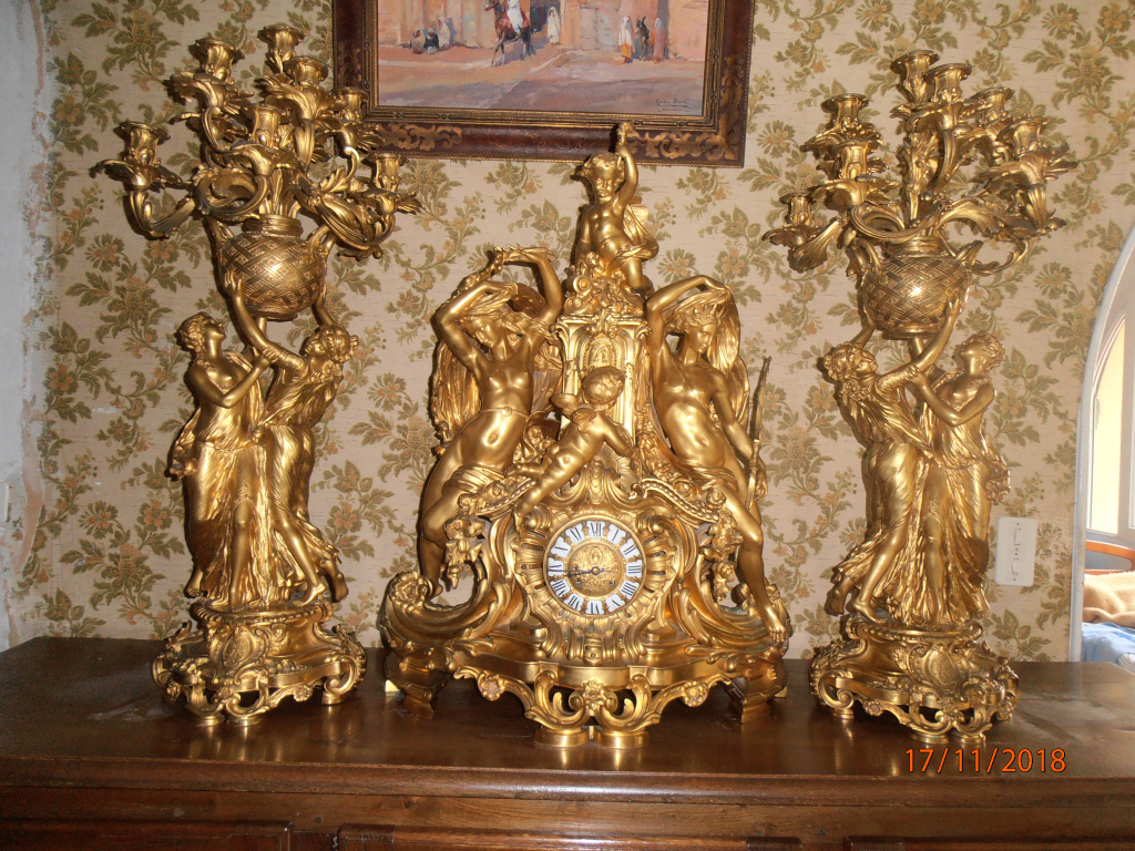 "Ces sculptures ont été acheté en 1938 dans une salle des ventes à Douai, C' est un ensemble en bronze doré qui se compose d'une horloge et de 2 candélabres. Je n'ai pas d'autres renseignements. C'est en très bon état, et très lourd..... Nous ne possédons aucun certificat."