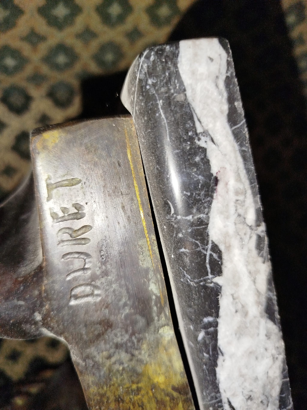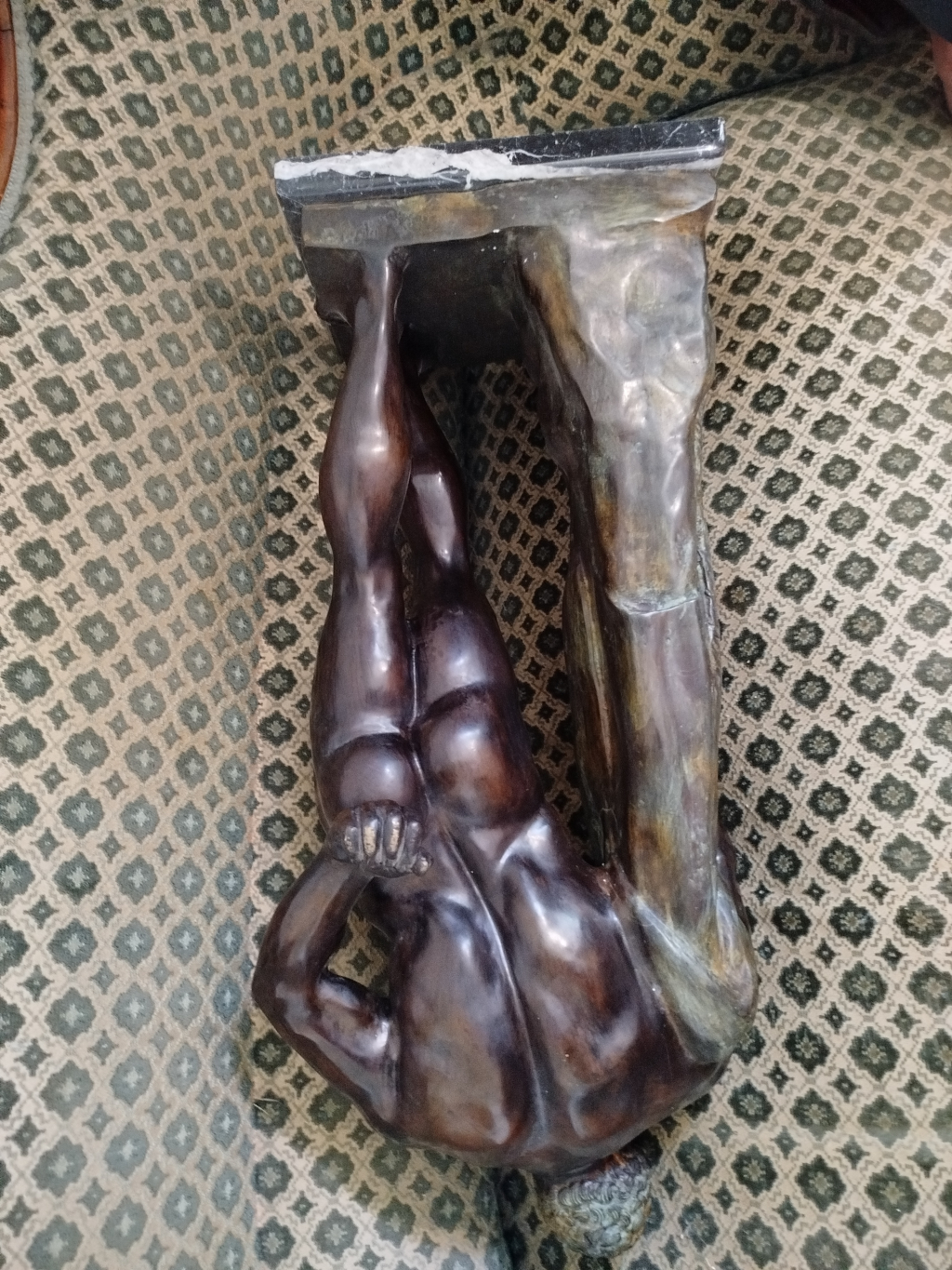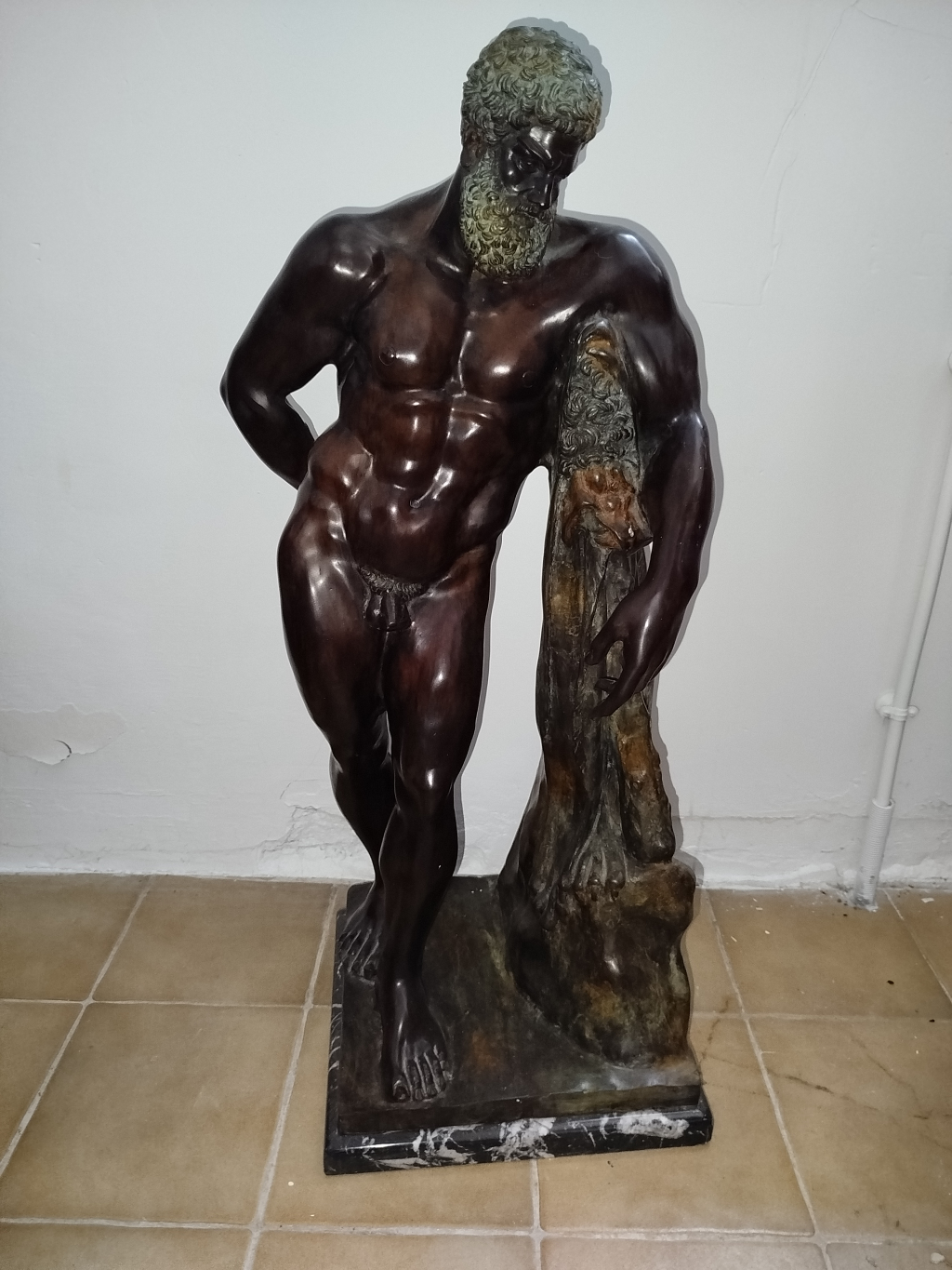 "Bronze d'un hauteur de 60cm. Une signature DURET. En très très bon état. Statue en bronze représentant un homme musclé, debout, appuyé contre une sorte de pilier sculpté avec tête animale. La statue repose sur un socle en marbre noir veiné blanc. Le bronze présente une patine homogène et brillante, sans rayures, fissures ou dommages visibles. La signature DURET est gravée sur une plaque métallique fixée sur le socle. L'œuvre est une sculpture artistique en bronze, réalisée avec un grand souci du détail anatomique et une finition soignée."