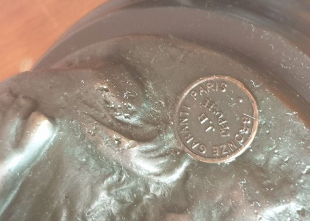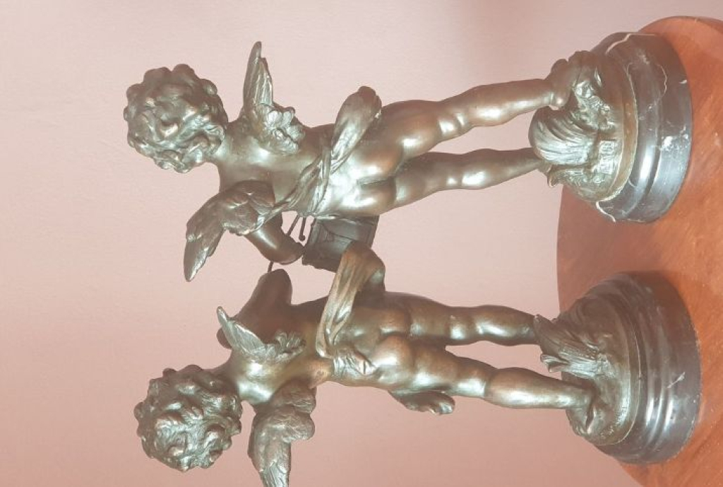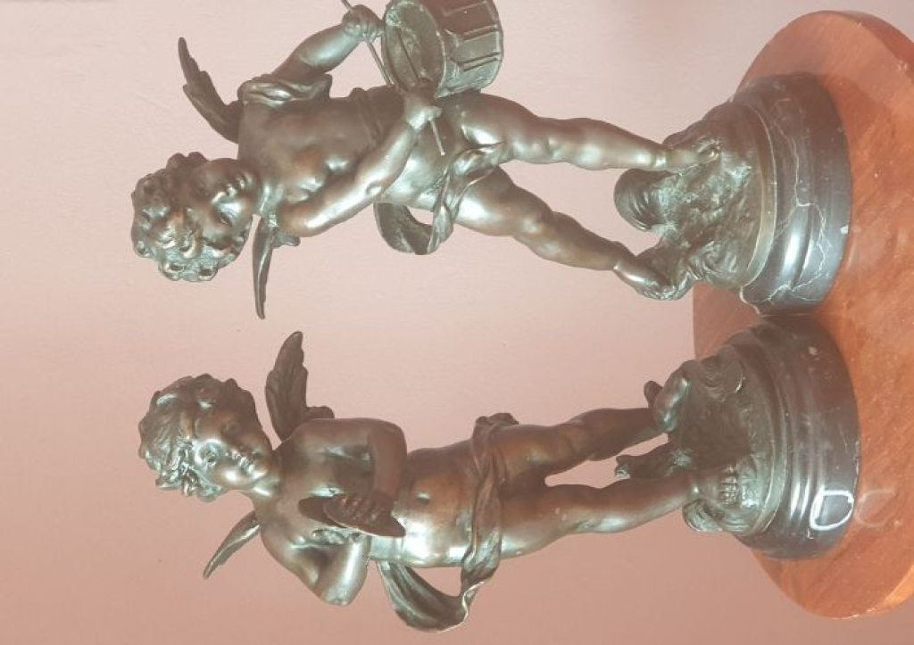 "Paire de sculptures représentant des amours ou putti jouant d'instruments, réalisés en bronze avec patine sombre. Chaque figure est montée sur un socle circulaire également en bronze. L'œuvre présente des détails fins dans les traits des visages, les ailes et les instruments. Les sculptures sont en bon état apparent, sans dégât visible ou cassure. Une inscription ou cachet est visible sur le socle, indiquant 'GRANDEUR ... PARIS' et un marquage supplémentaire suggérant une provenance ou un atelier reconnu. Ces sculptures de style classique sont typiques des objets décoratifs en bronze finement ciselé souvent utilisés en décoration intérieure ou collection."