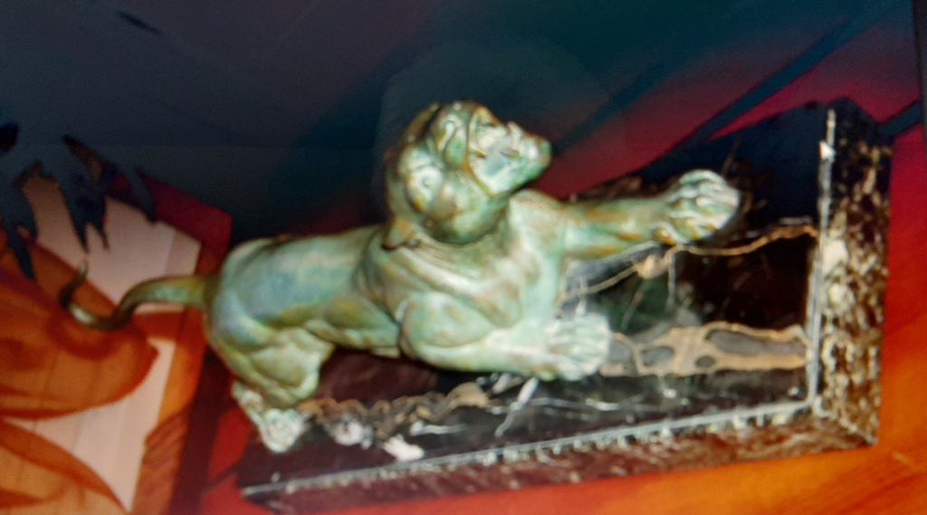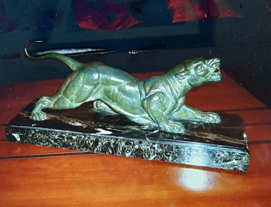 "Panthère feulant bronze sur socle marbre signé. Cadeau reçu en 1948"