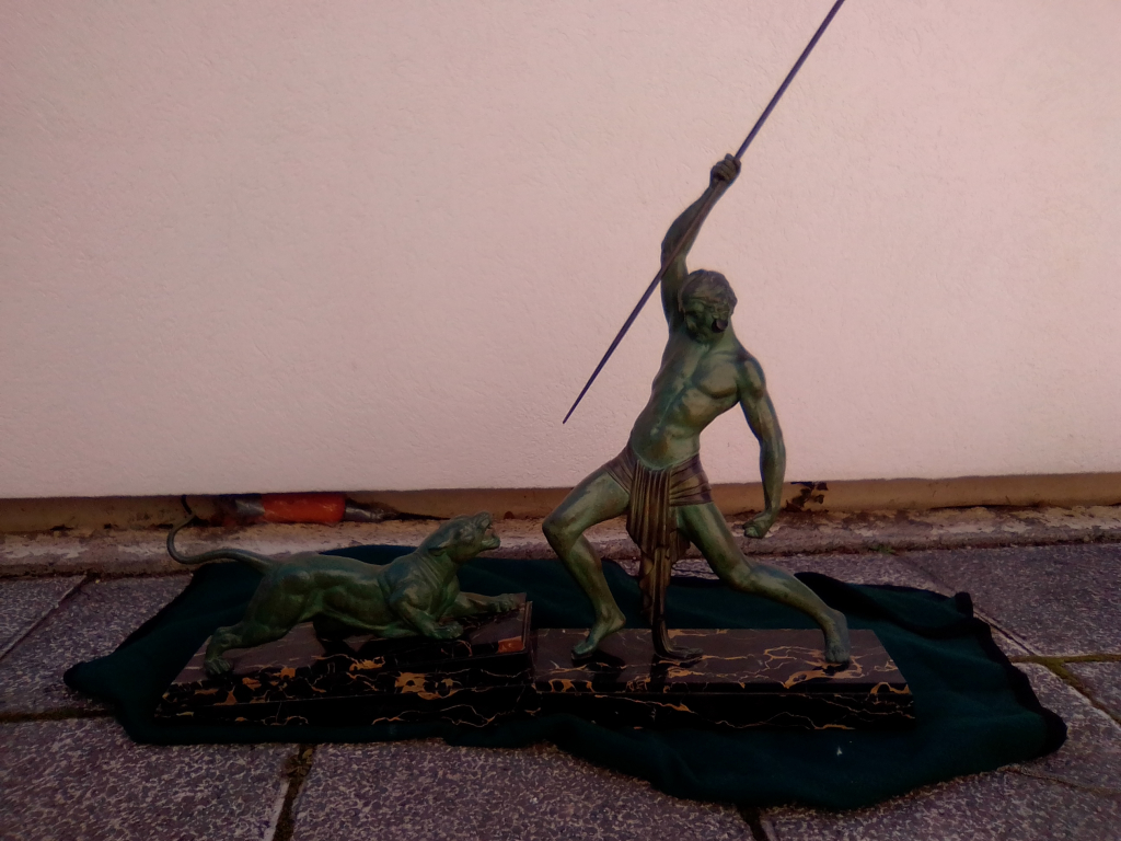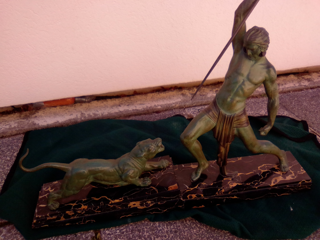 "Ensemble lion- chasseur sur socle type marbre noir veiné d'or. Concernant le lion, sa longueur est de 40 cm et sa hauteur de 15cm. Concernant le chasseur, sa longueur est de 35 cm et sa hauteur de 60 cm. Ce dernier tient à la main une lance de longueur 60 cm. La longueur totale de l'ensemble est de 93 cm. Je ne connais pas l'ancienneté de cette oeuvre . Je ne sais pas non plus s'il s'agit d'un réel bronze ou non."