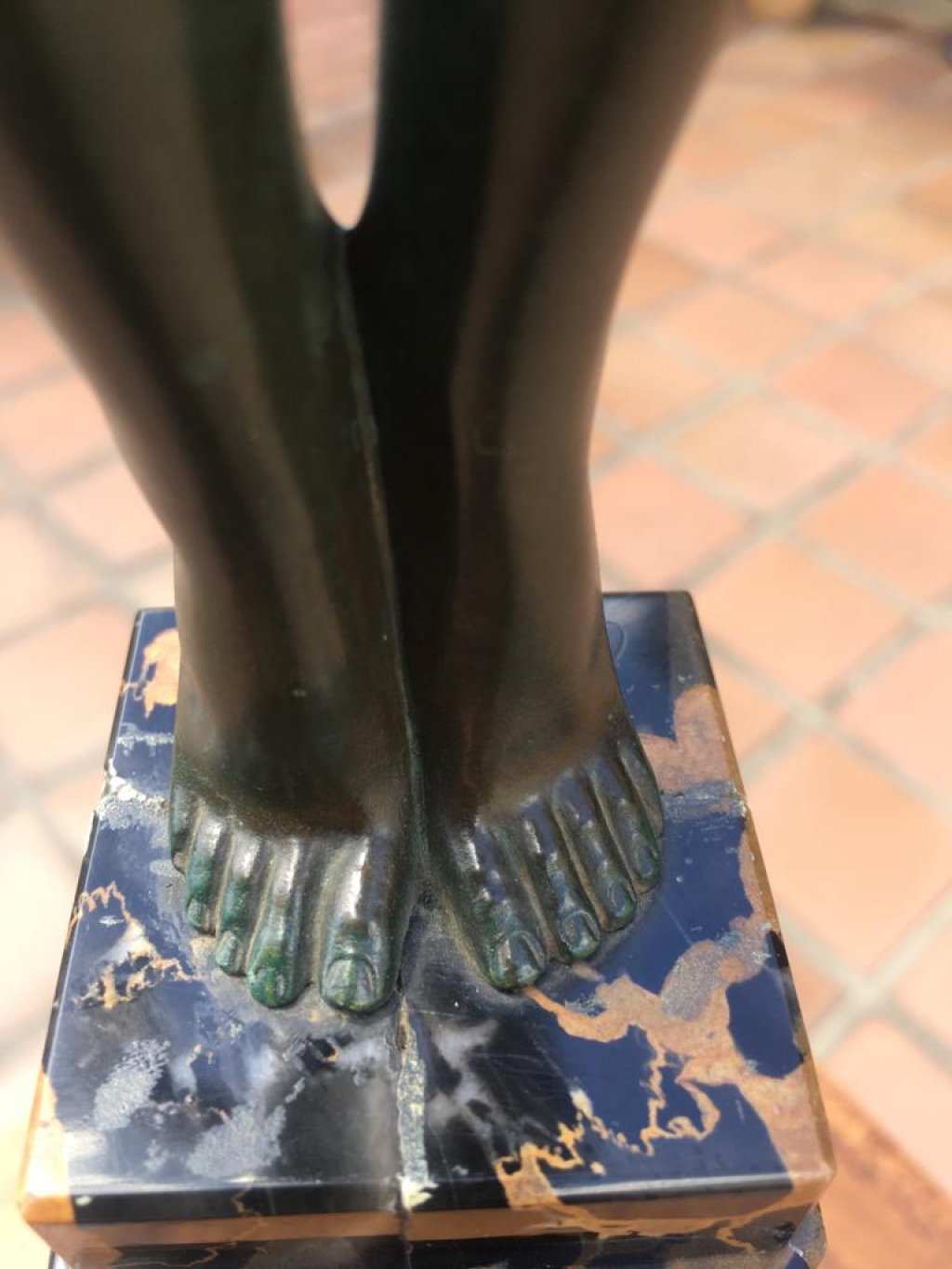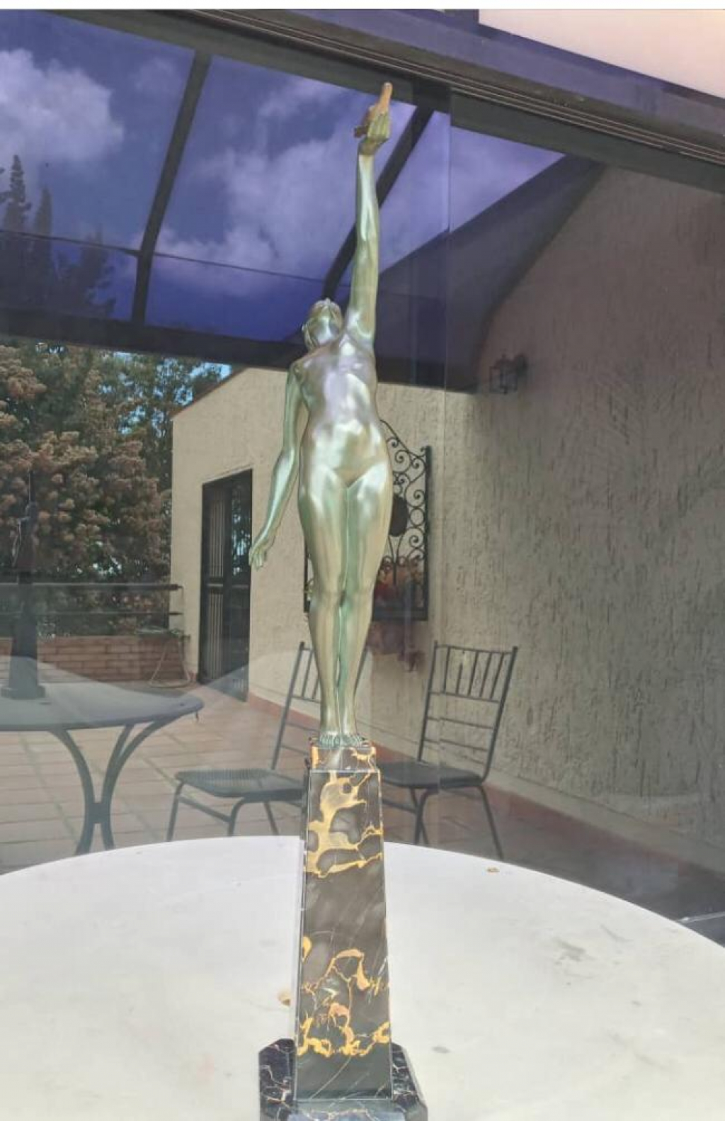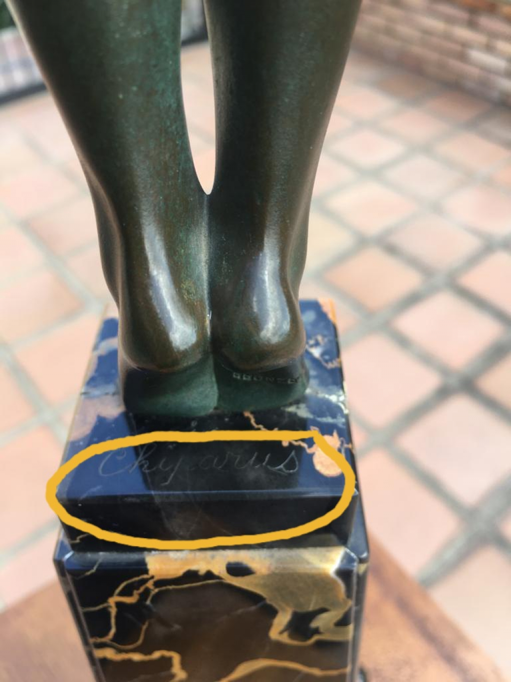 "Artiste: Demetre H. Chiparus Oeuvre: Sculpture en bronze. Titre: Femme avec oiseau à la main, sur une base en marbre. Signature: Signée "Chiparus" sous la plante des pieds, au sommet de la base. Hauteur de la base: 28,5 cm Hauteur de la femme: 50 cm Poids: 5,100 Kgs. Provenence: Acheté a Paris en 1981, signée "Etling Paris" Sur le côte de la base."