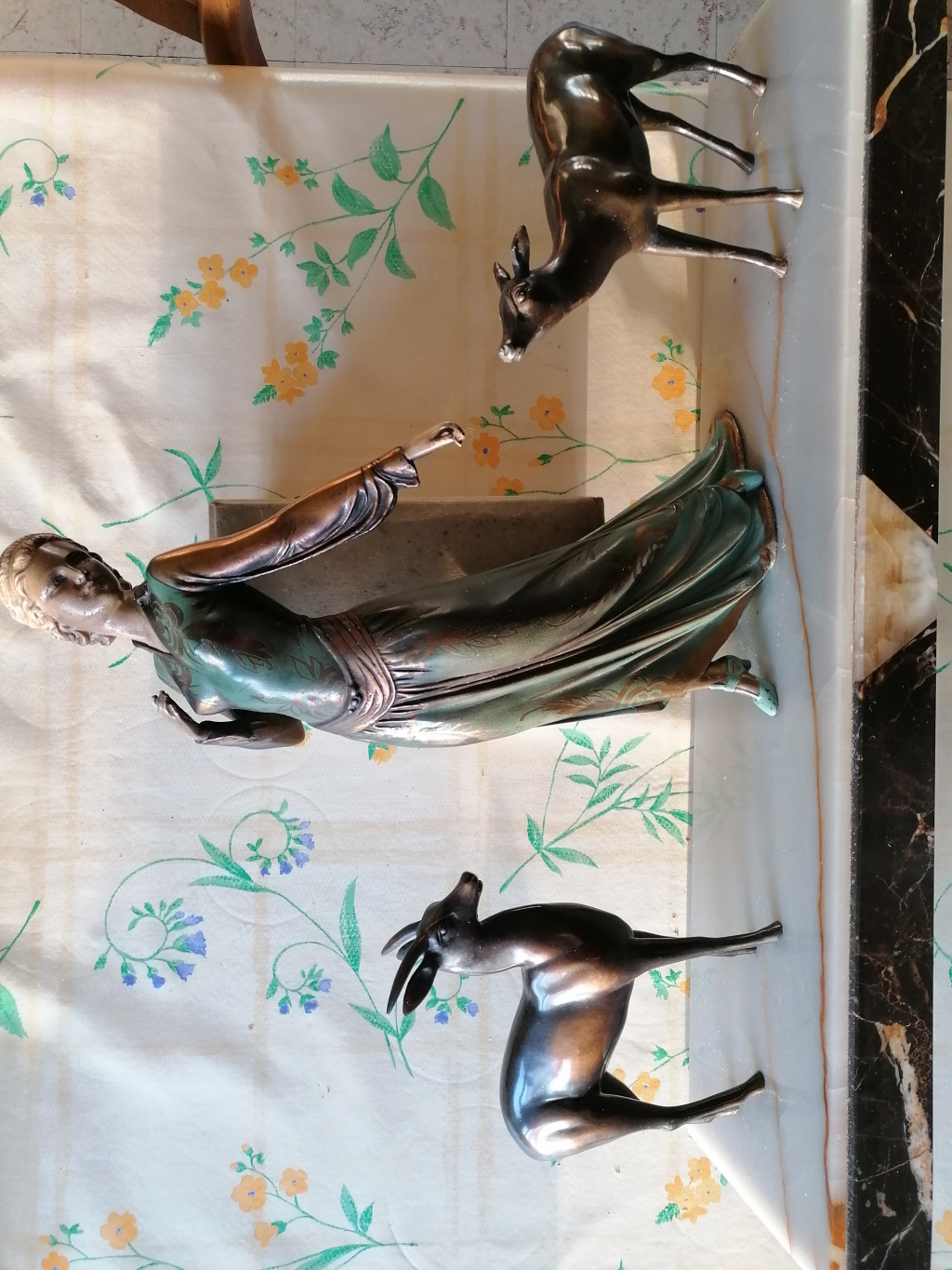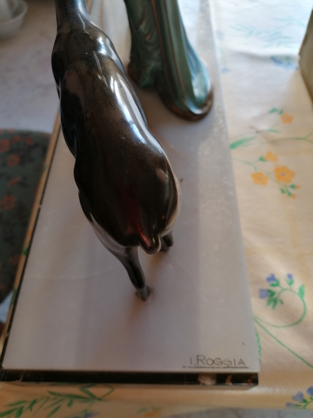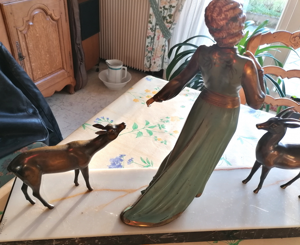 ""I.Roggia" sur coté . pas d'ivoire. posture semblable de l'Élégante au lévrier. table blanche fine ( marbre) sur socle marbré noir. trois patines différentes sur la dame, deux biches à la patine marron brillante. sans document. suite à décès dans la famille"