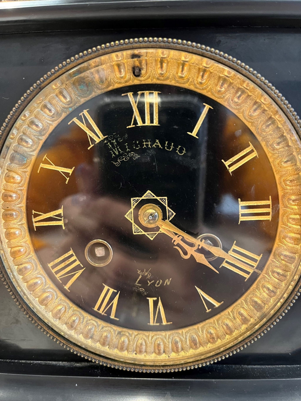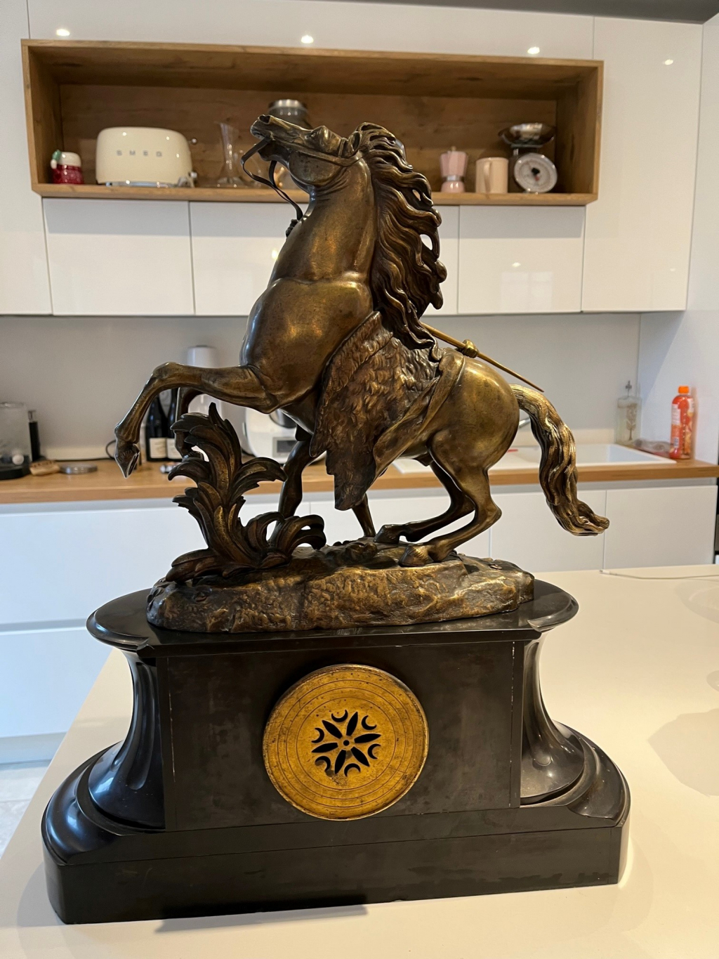 "Garniture de cheminée Bronze de Guillaume Coustou - Cheval de Marly exemplaire n°899 sur socle horloge signée Michaud avec paire de candélabres en Bronze Les dimensions données plus bas sont celles du Bronze"