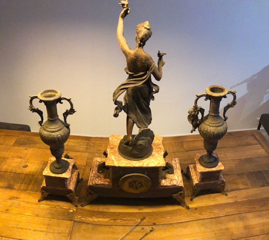 La première approche d’un professionnel du marché de l’art est visuelle. Nos équipes étudient dans un premier temps les différentes photographies de vues d’ensemble et de détails envoyées par le déposant avec sa demande : Garniture de cheminée Marbre rose et statue en régule signée Antoine Jean GUILLOT.