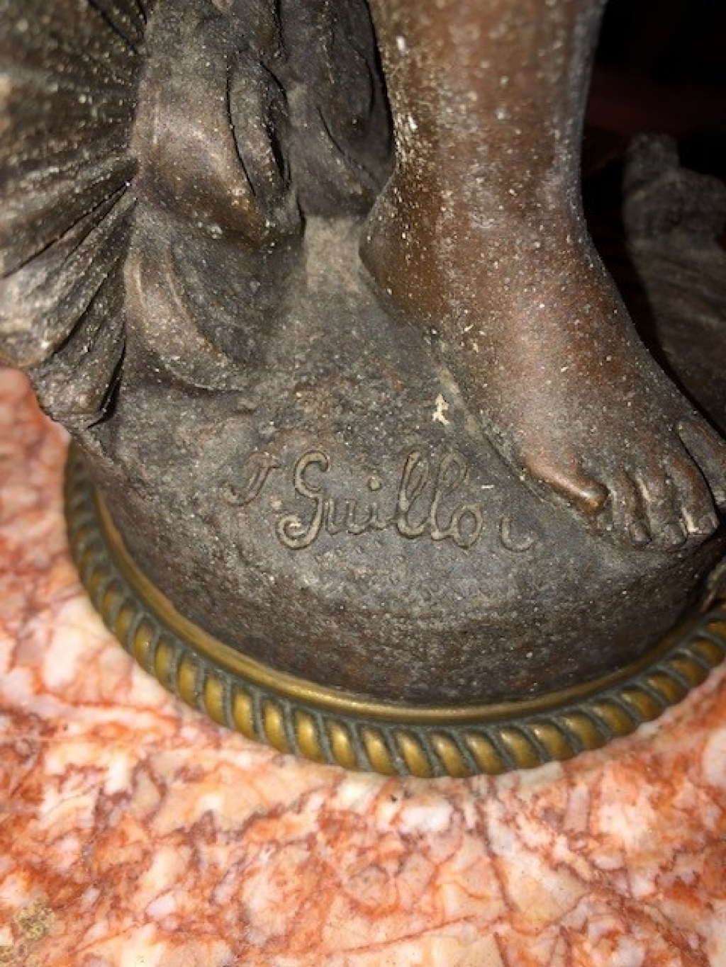 France estimations a reçu la demande d'estimation suivante intitulée par le déposant : Garniture de cheminée Marbre rose et statue en régule signée Antoine Jean GUILLOT.