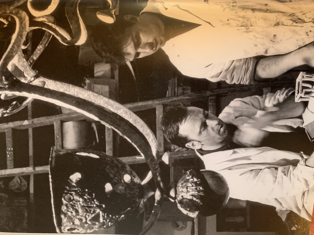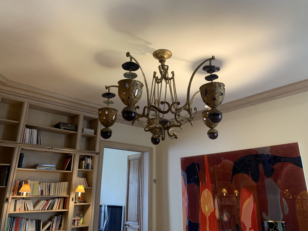 "Grand lustre "Alien" (c'est moi qui l'appelle comme ça) en bronze et verre de Hubert Le Gall. Diamètre environ 2m. Hauteur 1,10m. Il était présent dans l'appartement parisien que nous avons racheté avec pratiquement l'ensemble du mobilier. Les propriétaires n'étant plus en France, ça les arrangeait de tout vendre avec l'appartement. Je n'ai pas de certificat mais l'origine semble crédible. Il y a aussi une console et toutes les poignées de portes du même artiste, qu'ils présentaient comme leur ami. Livre dédicacé par l'artiste à ces personnes, dans lequel apparaît une photo de l'artiste avec le lustre en question."