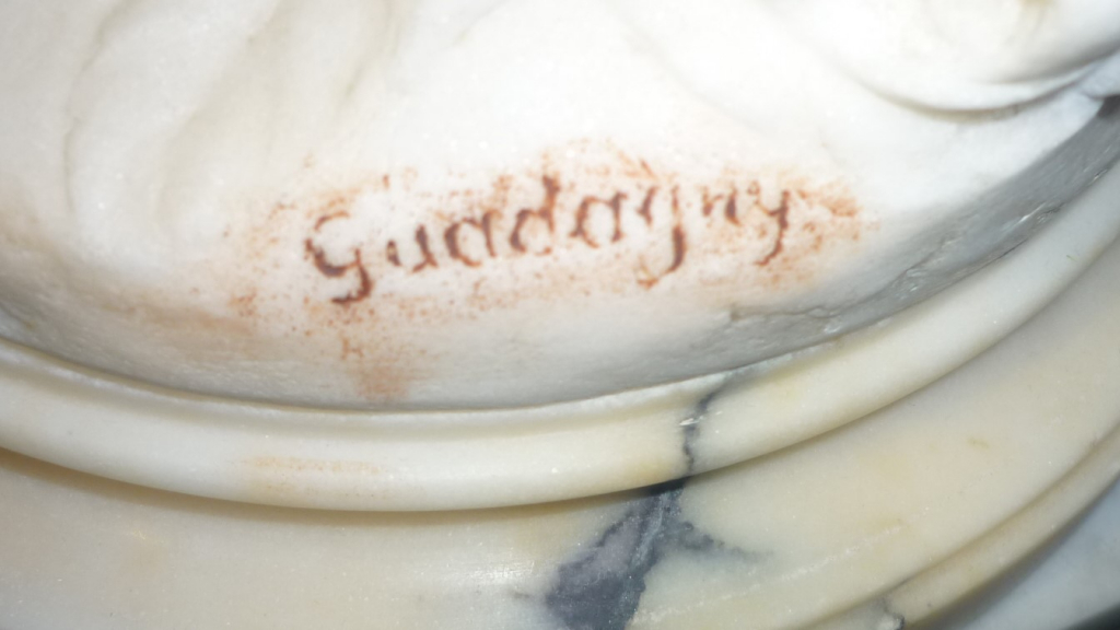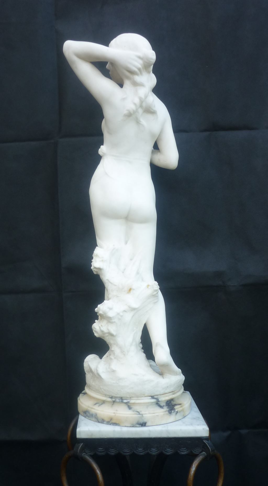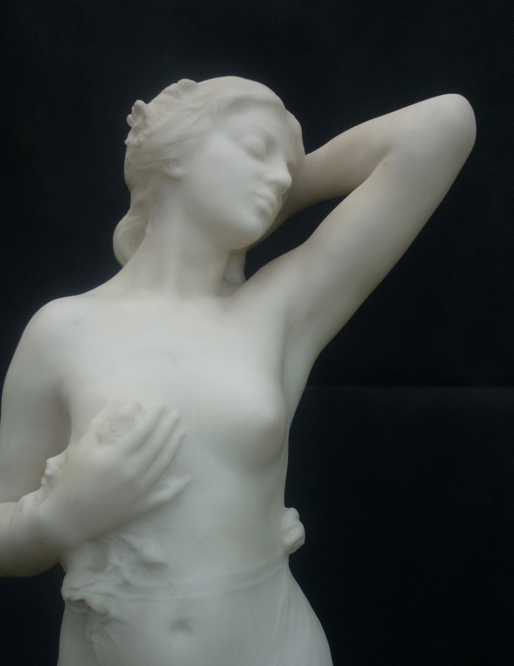 "Grande sculpture XIX éme en marbre blanc , représentant une jeune femme nu en pied, une fleur dans les cheveux ,une main derrière la tète , un voile a la taille retenu par des roses , Base naturaliste avec rocher et roses signée guadagny Base en marbre blanc veiné noir moulurée. pas de manque ni fêle hauteur totale 79 cm ,marbre seul 74.5 cm base diamètre 24 cm poids 25 kg"