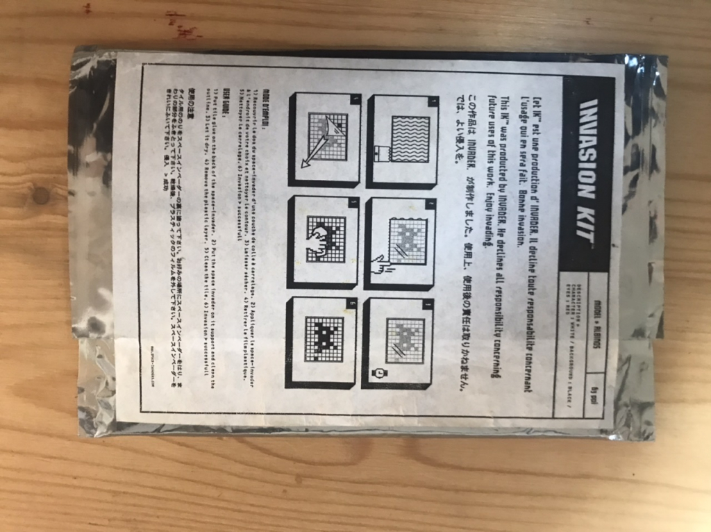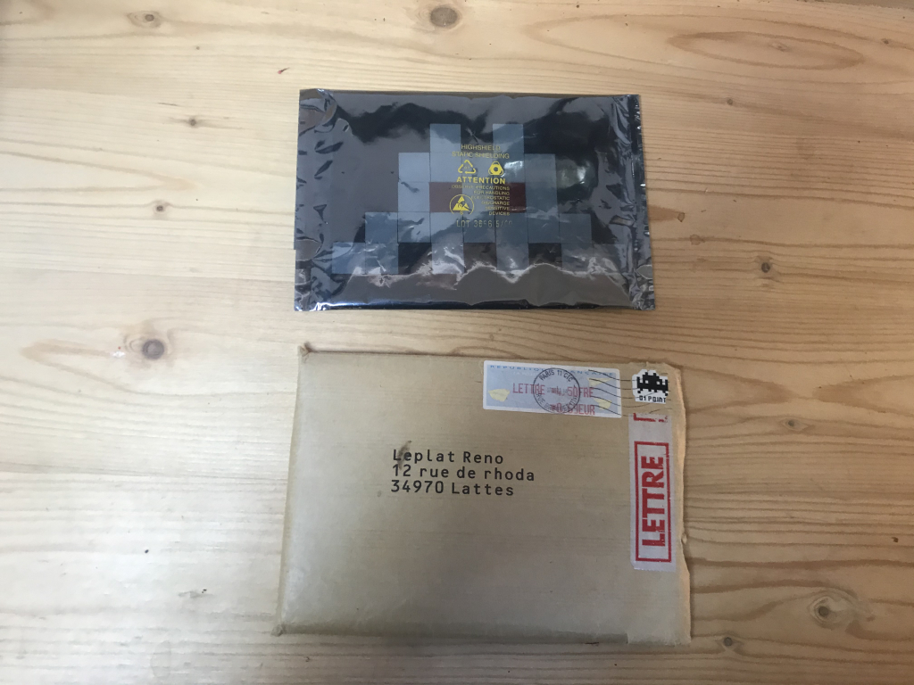 "Le premier kit d’invasion de space invaders vendu avec l’enveloppe originale, et une planche d’autocollant dédicacé"