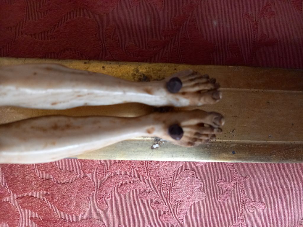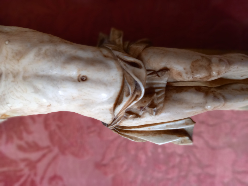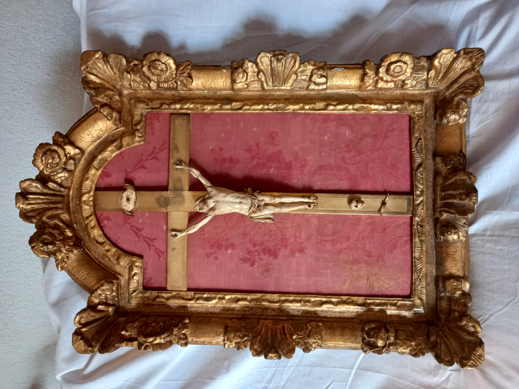"encadrement bois et stuc doré d'époque Jésus en ivoire croix en bois doré tissus d'époque"